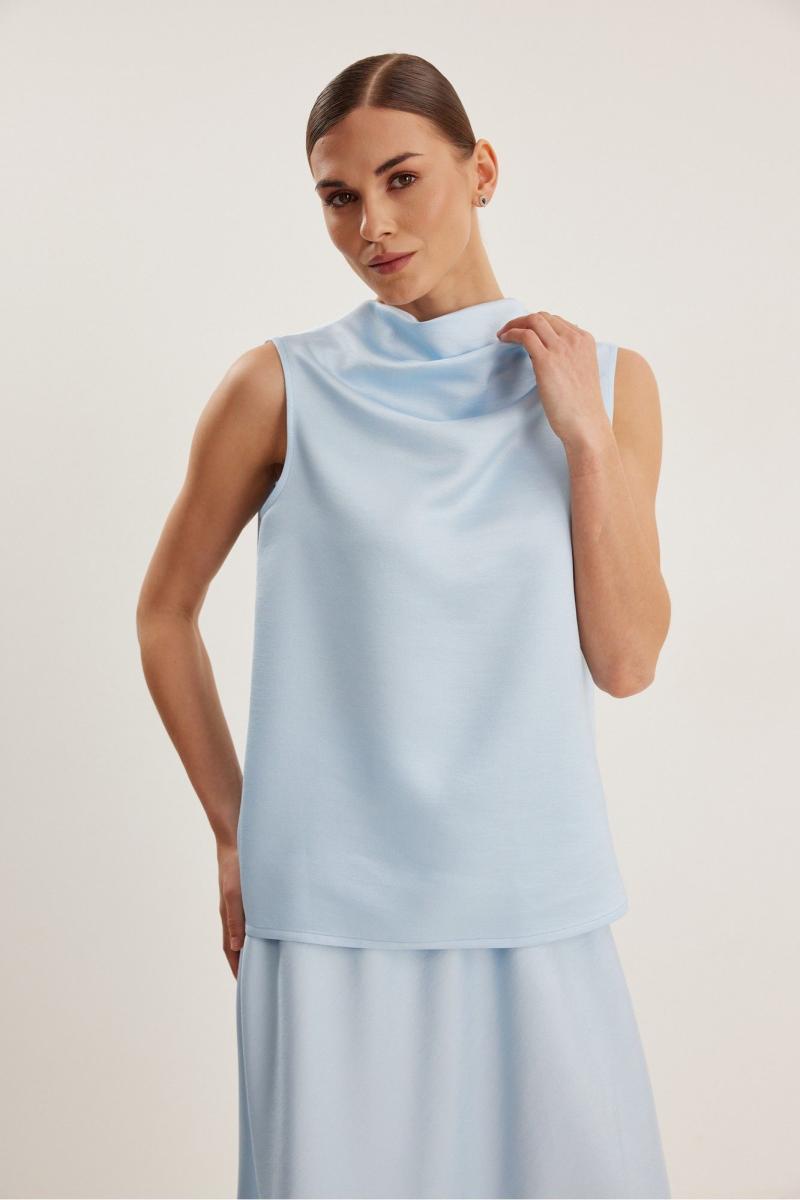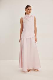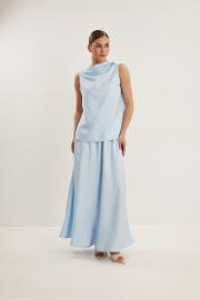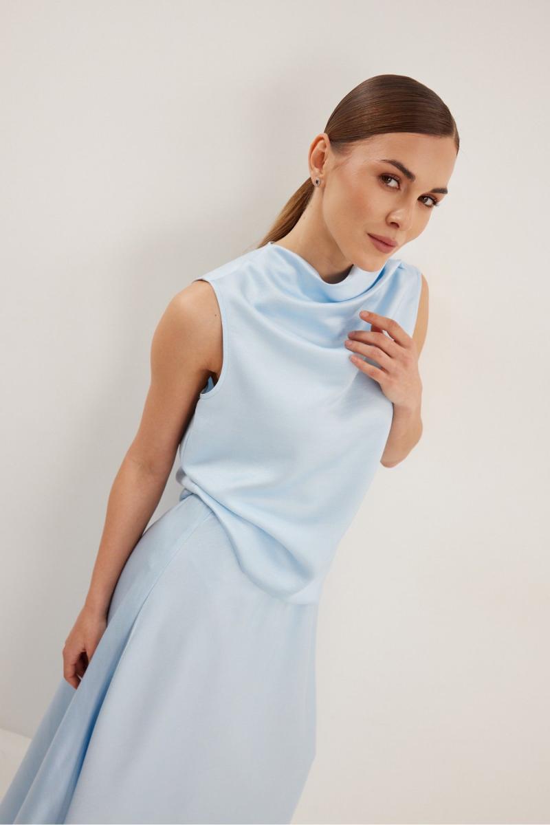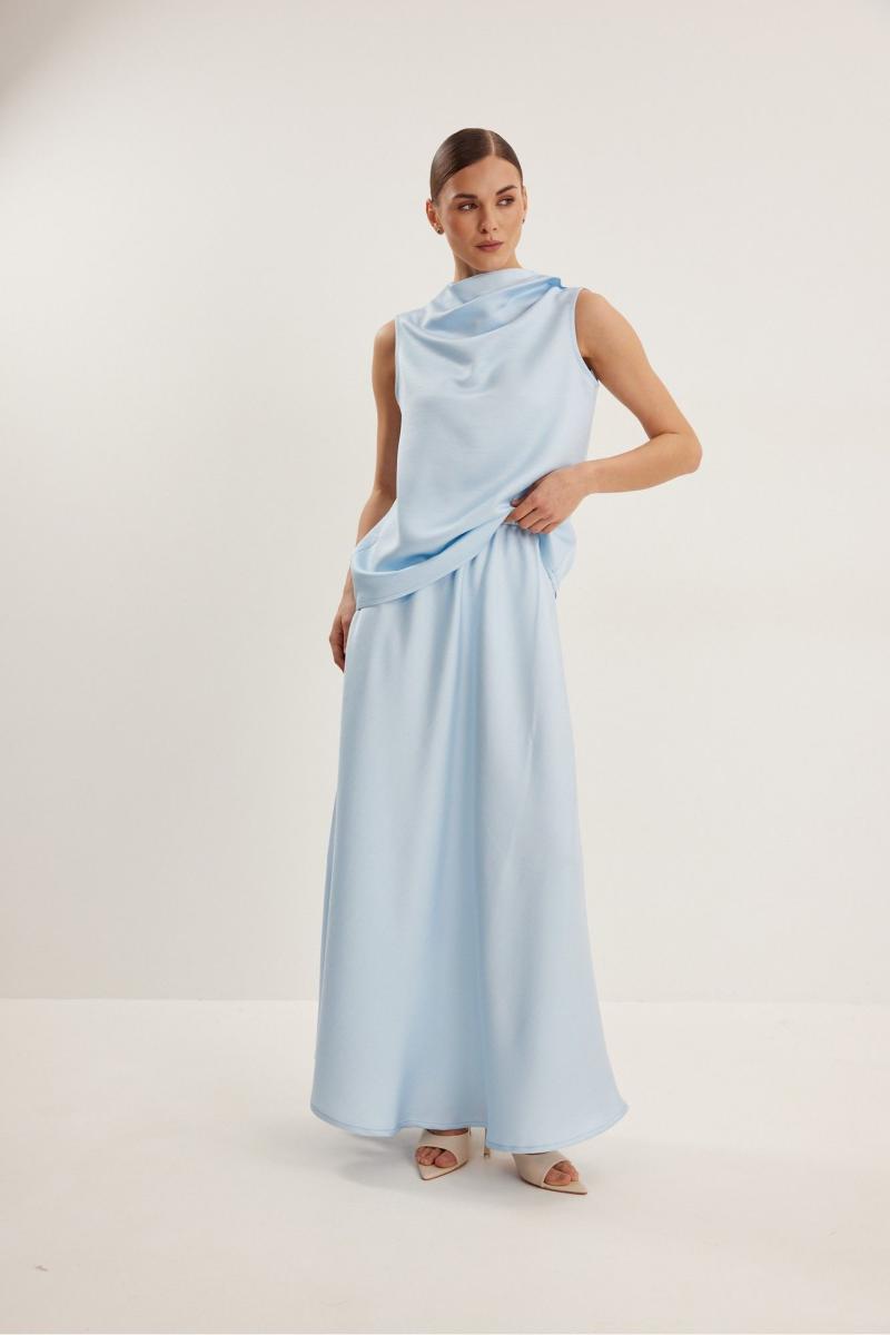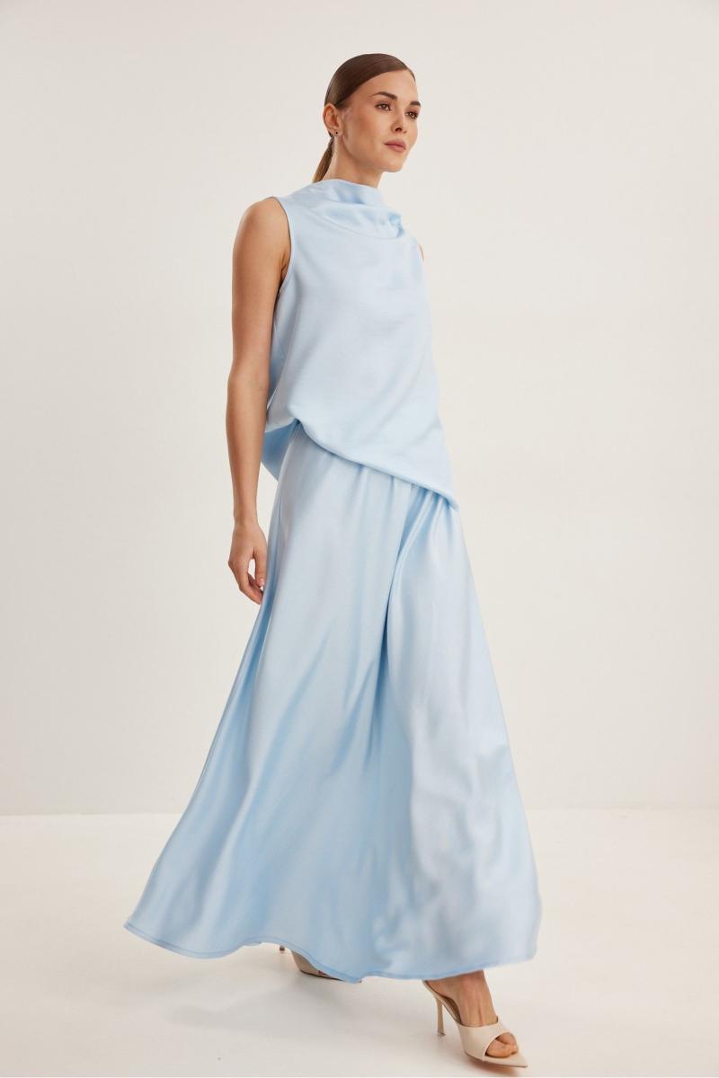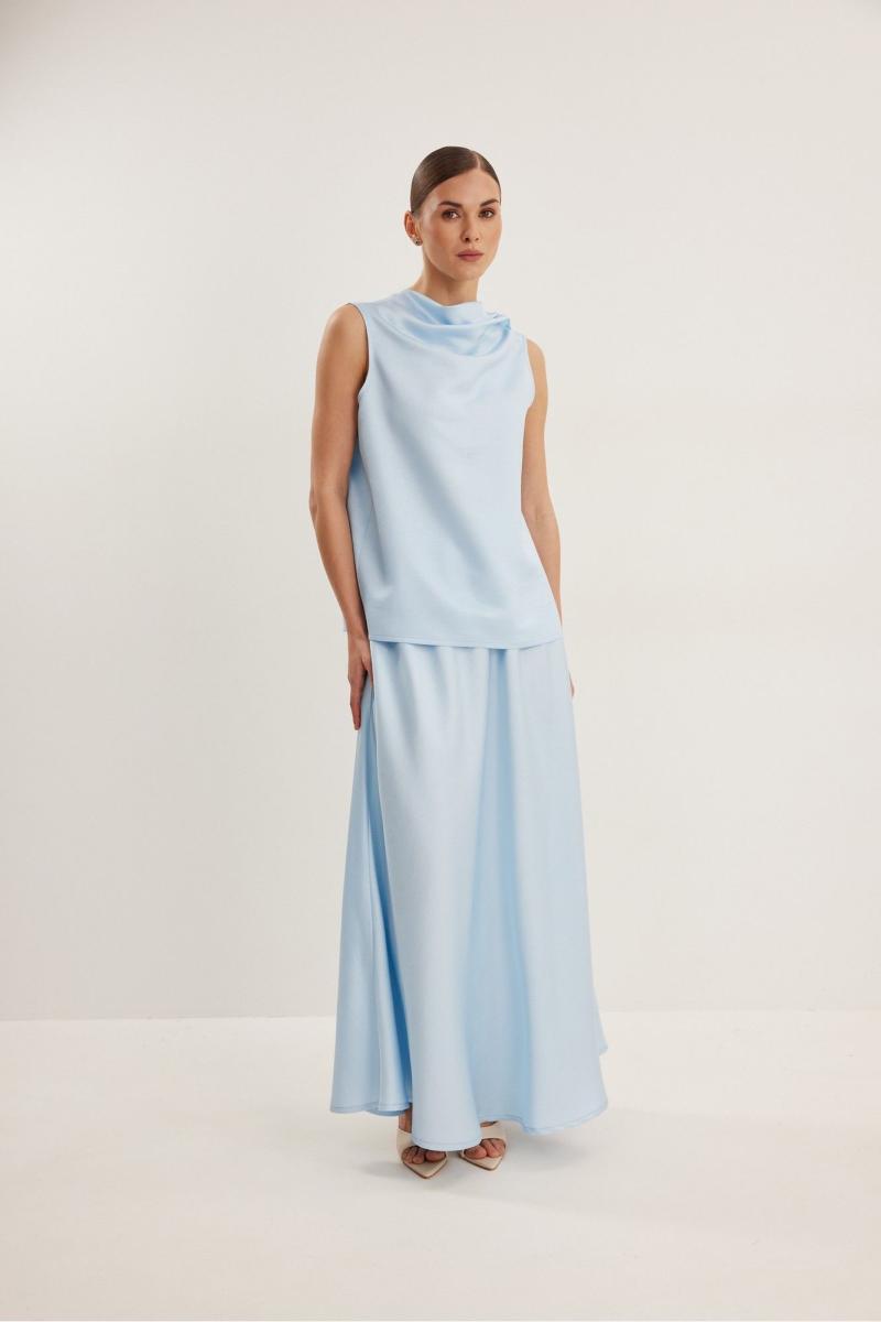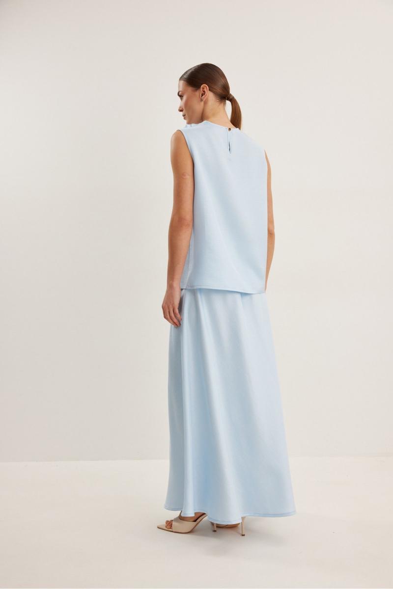 Комплект женский , состоящий из блузы и юбки .Блузка женская полуприлегающего силуэта , выполненная из смесовой вискозы . Горловина в виде драпировки . В верхней части спинки разрез с пуговицей.Юбка женская , свободного силуэта выкроена по косой . Верхний край юбки обработан эластичной тесьмой (резинкой).