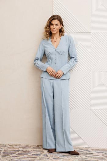 Комплект: жакет + юбка. Комплект выполнен из твида. Жакет прямого силуэта, длиной выше линии бедер. Застежка спереди центральная бортовая на пуговицы. Спинка цельная. Воротник стояче-отложной закругленной формы. Рукав втачной, двухшовный. Жакет на притачной по низу подкладке. Воротник, борт, клапаны, низ жакета и рукава декорированы контрастным кантом. Юбка прямого силуэта, на притачном поясе, длиной выше линии колена. Спереди декоративные клапаны. Застежка в среднем шве спинки на потайную молнию и пуговицу. Юбка на отлетной по низу подкладке. В комплект входит съемная брошь-бант из фатина.