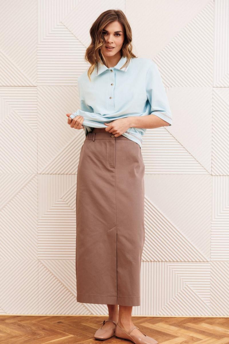 Костюм состоит из джемпера и юбки. Джемпер прямого силуэта с воротником поло. Рукав втачной одношовный. По низу изделия, по низу рукава и по воротнику проложена отделочная строчка. Длина джемпера- 66 см, длина рукава - 30 см. Юбка прямого силуэта выполненная из джинсовой ткани. Передняя честь юбки с вытачками, со средним швом и застежкой гульфиком на молнии и щлицей спереди. Задняя часть юбки с вытачками. Юбка на притачном поясе с затежкой на петлю и пуговицу спереди и резинками по бокам. Длина юбки с учетом пояса - 90 см.
