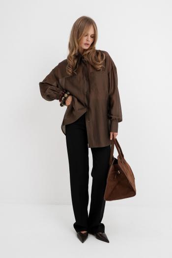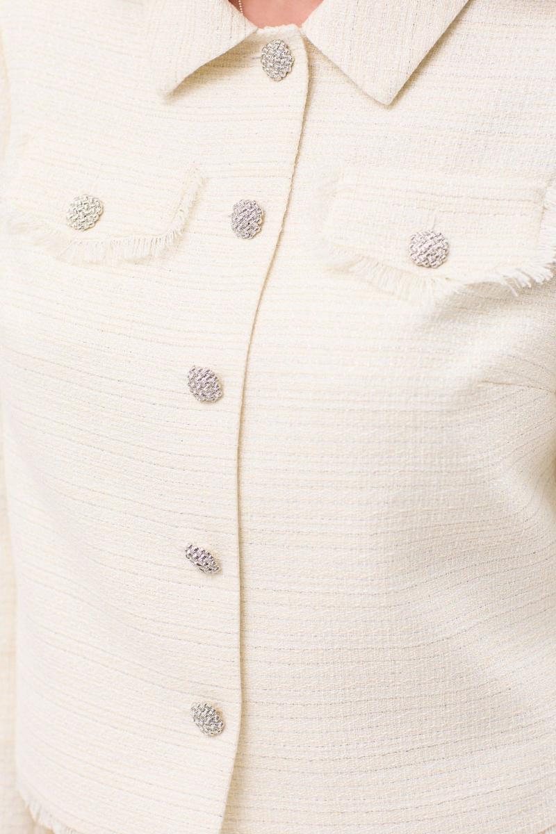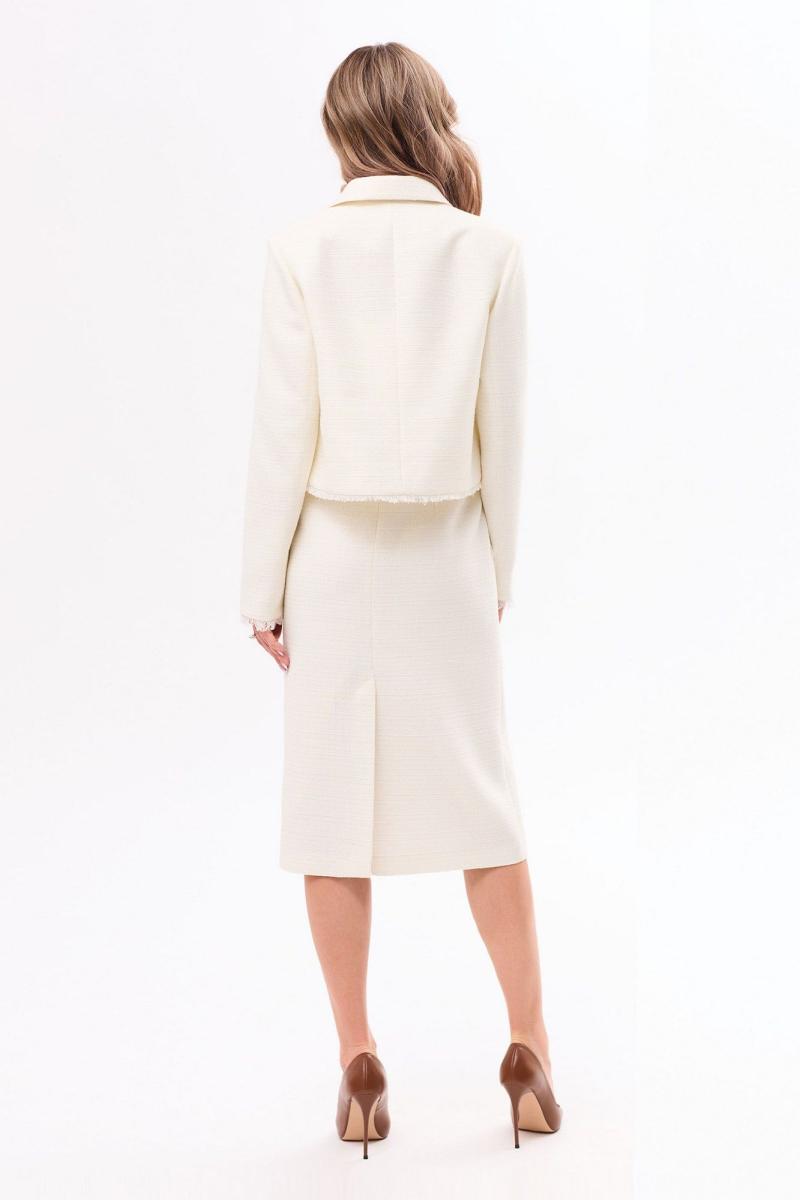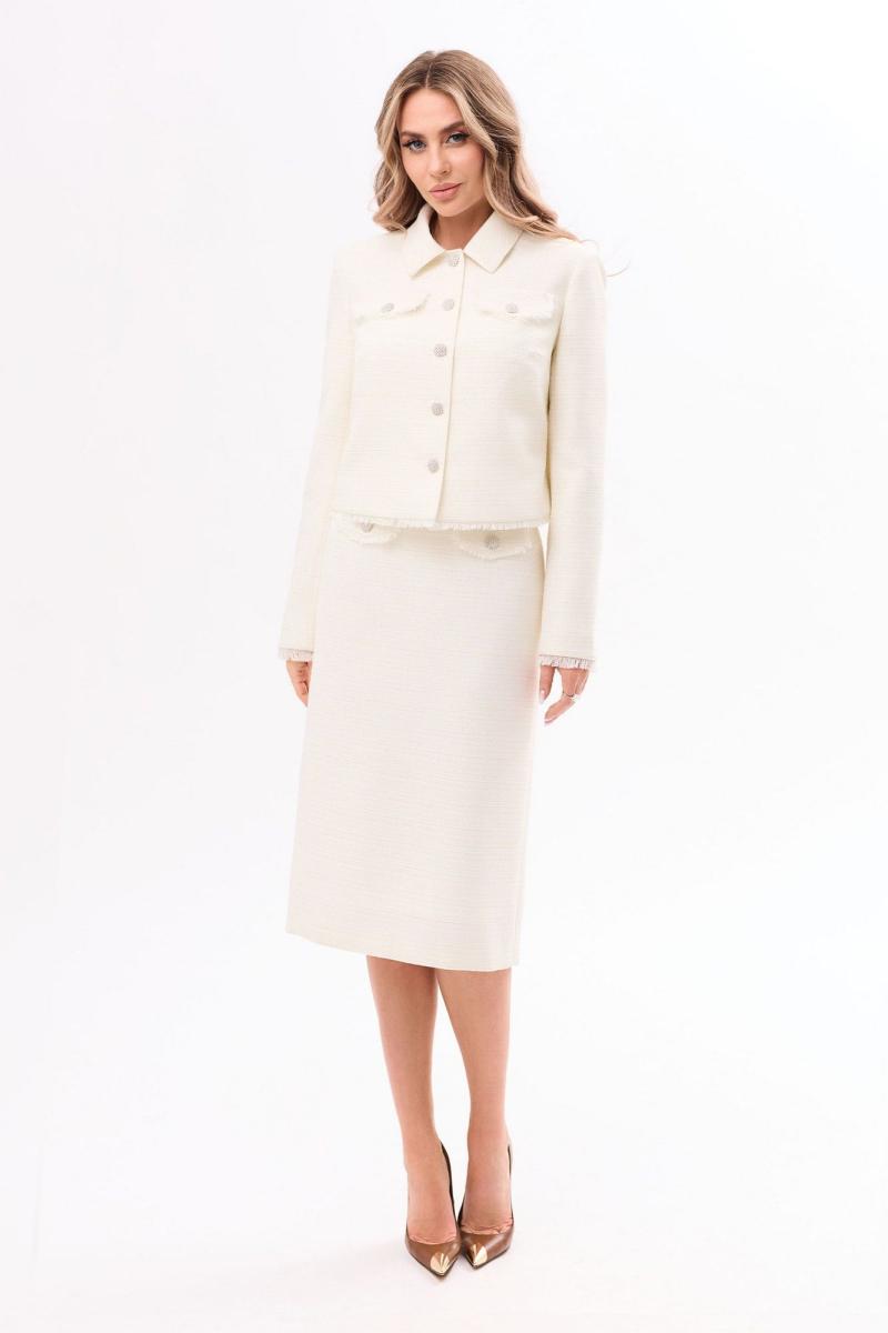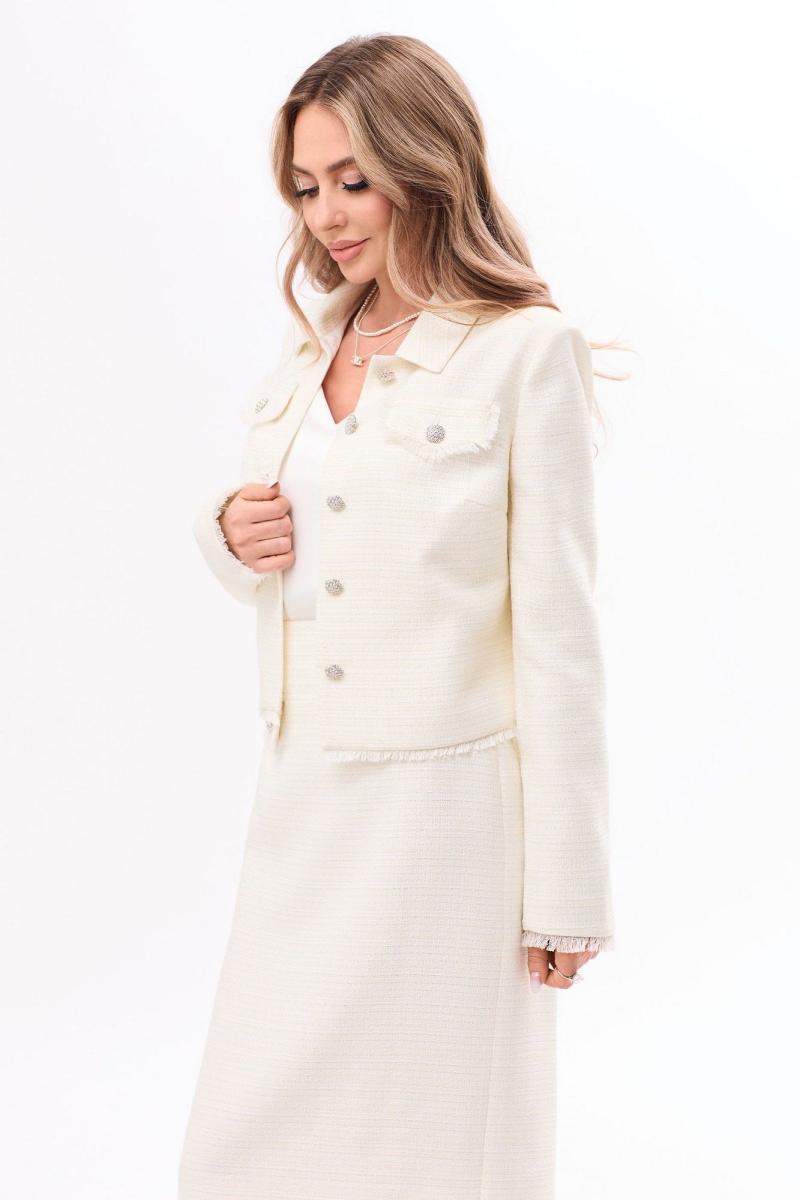 Жакет с центральной застежкой на петли и пуговицы, с отложным воротником. По переду с нагрудными вытачками. На уровне линии груди расположены клапаны с бахромой из основной ткани. Спинка со средним швом. По низу спинки и полочек бахрома из основной ткани. Рукав втачной, длинный. По низу рукава бахрома из основной ткани. Юбка без пояса. Верхний срез обработан обтачками. Застежка на потайную молнию в среднем шве спинки. Заднее полотнище со средним швом, заканчивающимся шлицей По переднему полотнищу на уровне линии бедер- клапаны с бахромой из основной ткани. Жакет, юбка на подкладке.
