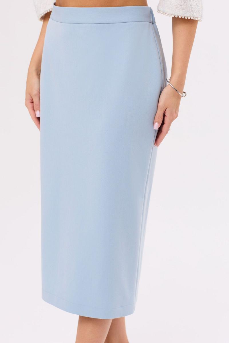 Блузка без воротника, с круглым вырезом горловины, застежкой на навесную петлю и пуговицу по горловине спинки. Перед с нагрудными вытачками. Спинка со средним швом, разрезом по горловине. Рукав короткий, цельнокроенный. Блузка со съемным поясом. По низу рукава, горловине и боковым сторонам пояса притачана декоративная тесьма с бусинами. Юбка с отрезным поясом, в области спинки пояс частично присборен на резинку. Заднее полотнище со средним швом, заканчивающимся шлицей, застежкой на потайную молнию в среднем шве.