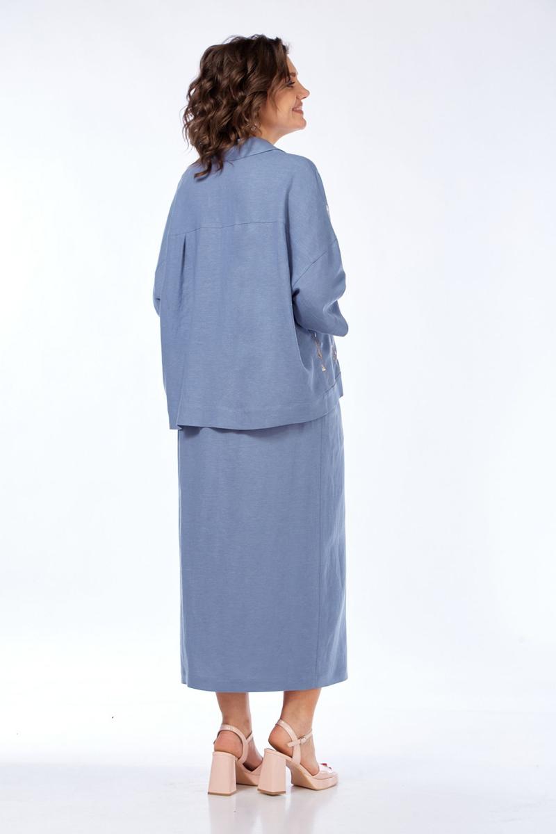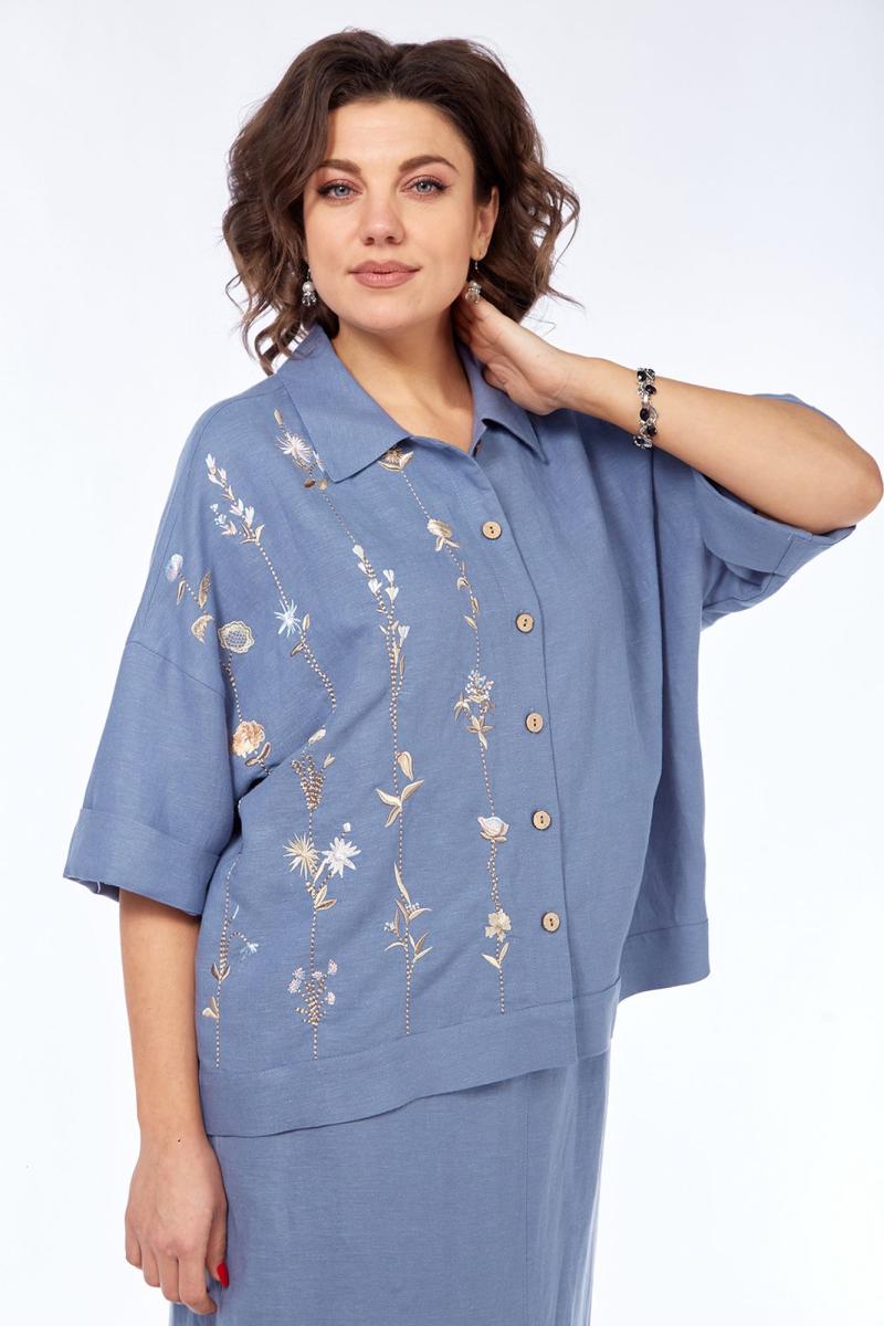 Костюм женский 2х-предметный, состоит из блузки и юбки, выполнен из натуральной ткани белорусского производства. Блузка свободного силуэта с воротником рубашечного типа и центральной застежкой на петли с пуговицами. Низ переда обработан притачной планкой. На спинке кокетка и складки. Рукава спущенные с отложными манжетами. Блузка декорирована вышивкой. Юбка прямого силуэта с притачным поясом, частично на эластичной тесьме. По переду обработаны боковые карманы, в центральном шве переда имеется шлица. Юбка на подкладке.