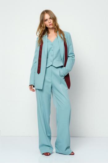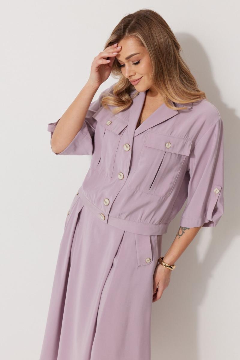 Костюм женский, состоящий из жакета и юбки. Жакет прямого силуэта без подкладки, длиной до линии бедра. По переду жакета настрочены накладные карманы с встречными складками. В шве притачивания кокетки расположен клапан кармана, застегивающийся на петлю и пуговицу. В среднем шве спинки расположена встречная складка. Рукав втачной одношовный, прямой. По низу рукава расположена пата, застегивающаяся на петлю и пуговицу. По низу жакета обработан отрезной пояс. Горловина обработана втачным воротником с лацканами. Застежка центральная , однобортная на петли пуговицы. Юбка женская на подкладке А – силуэта длиной до середины икры. По переду юбки заложены встречные складки и нстрочены клапаны с декоративными пуговицами. Спинка юбки цельная. Карманы обработаны в боковом шве юбки. По левому боковому шву юбки находится застежка – молния. Верхний срез юбки обработан притачным поясом с резинкой по спинке. Длина спинки жакета 53 см, длина рукава 52 см, длина юбки по боковому шву 78,5 см.