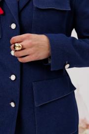 Комплект состоит из джинсовой юбки и жакета. Лаконичная юбка макси — основа базового гардероба. А - силуэт. Отрезной пояс обеспечивает комфортную посадку по фигуре. По переду карманы с наклонным входом. Длина - 90 см. Приталенный жакет с накладными карманами. Жакет на подкладке. По переду в верхнем кармане декор из алых перчаток, которые можно носить для создания аристократичного образа. По спинке регулируемый пояс для более заталенного и женственного силуэта. Длина - 69 см.