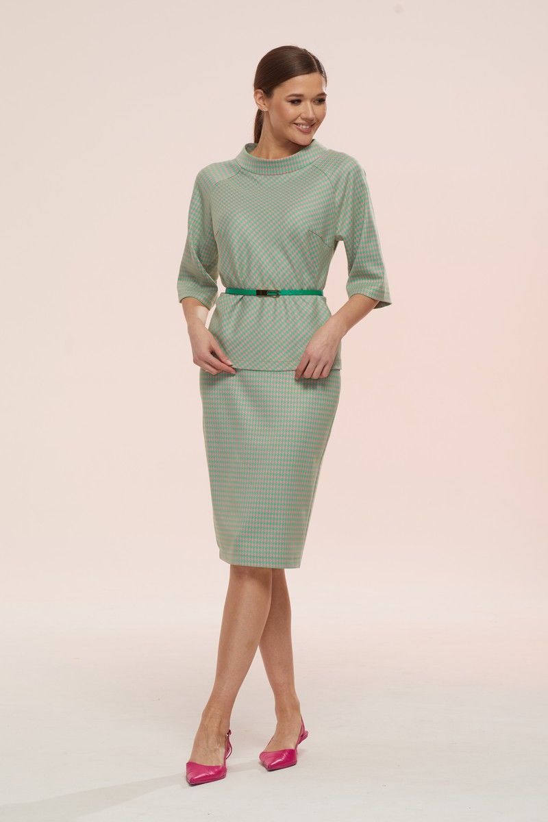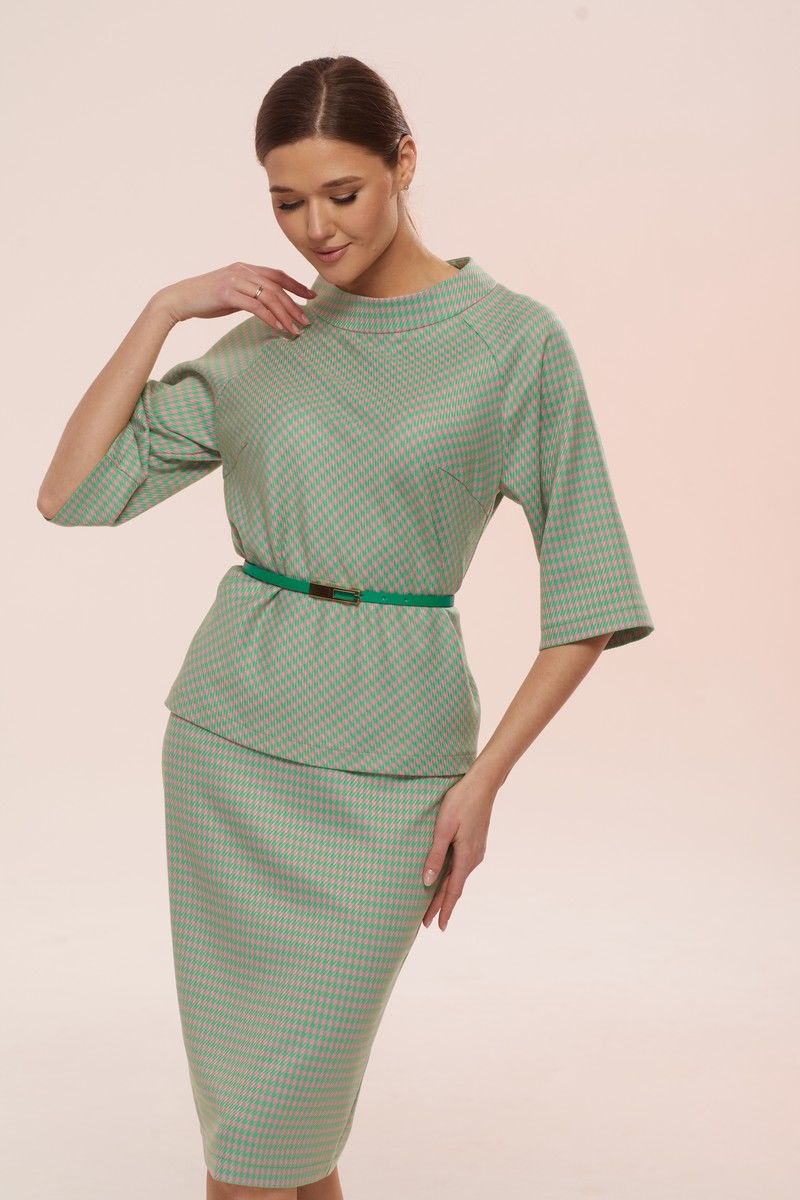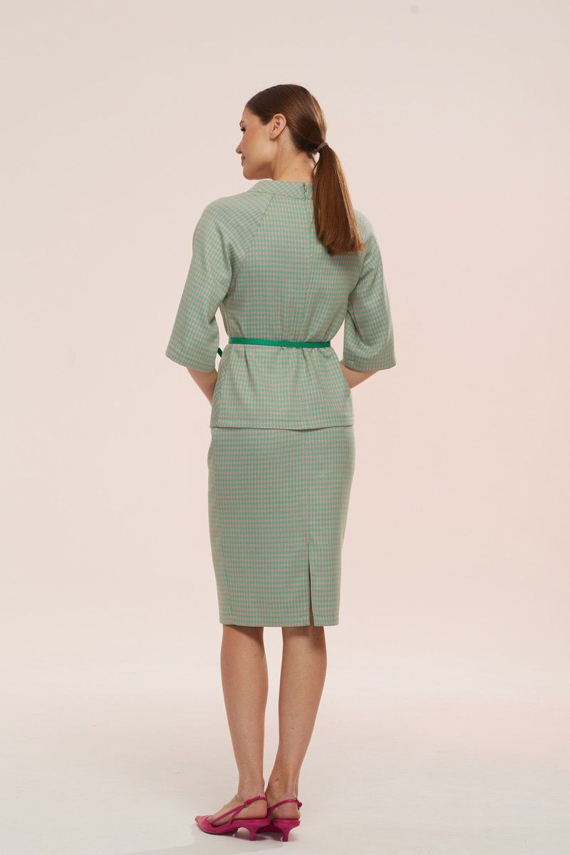 Стильный комплект, состоящий из блузона и юбки, из костюмной ткани. Блузон прилегающего силуэта, слегка расклешён к низу. Спинка со средним швом. В среднем шве спинки – потайная застёжка-молния. Длина по спинке – 56,5 см. Горловина обработана стойкой – воронкой, высотой- 3,5 см. Рукав – реглан, слегка расклешён к низу. Длина рукава – 41,5 см. Юбка прилегающего силуэта, зауженная к низу, по среднему шву – потайная застёжка на тесьму – молнию, в низу – разрез. Верхний край обработан обтачкой. Длина юбки по боковому шву – 64 см. Юбка на подкладке. Декор – ремень, может отличаться от заявленного на фото.