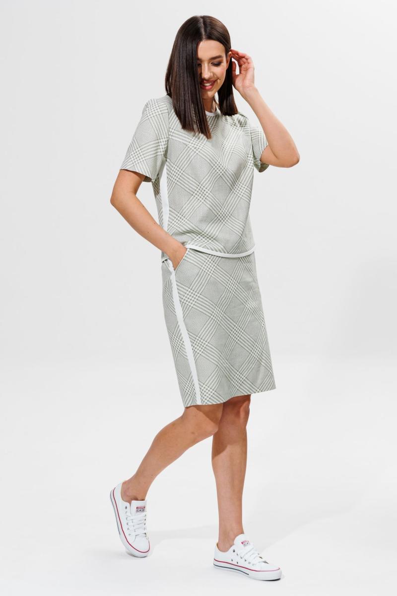 Классный юбочный комплект, состоящий из блузона полуприлегающего силуэта. По переду блузона нагрудные вытачки, притачная планка из отделочной ткани, шириной 1,2 см. Потрясающе подчёркивает изящество фигуры боковая вставка из отделочной ткани, шириной 2,7 см. Горловина переда блузона обработана притачной планкой из отделочной ткани, шириной 1,2 см. Спинка блузона с талевыми вытачками, располагающимися в горловине. По среднему шву спинки: металлическая разъёмная тесьма-молния. Горловина спинки обработана обтачкой. Длина блузона по спинке: р.44-48: 53,5 см; для р.50-52: 54,5 см. Рукав втачной, одношовный, длиной 24 см. Юбка блузона на кокетке с боковыми, функциональными, наклонными карманами. С боковой вставкой из отделочной ткани, шириной 2,7 см. По среднему шву юбки потайная застёжка-молния, внизу разрез. Верхний край юбки обработан обтачкой. Юбка на подкладке. Длина юбки по боковому шву: для р.44-48: 59,5 см; для р.50-52: 62 см. Цвет комплекта может отличаться на полутон от заявленного на фото.