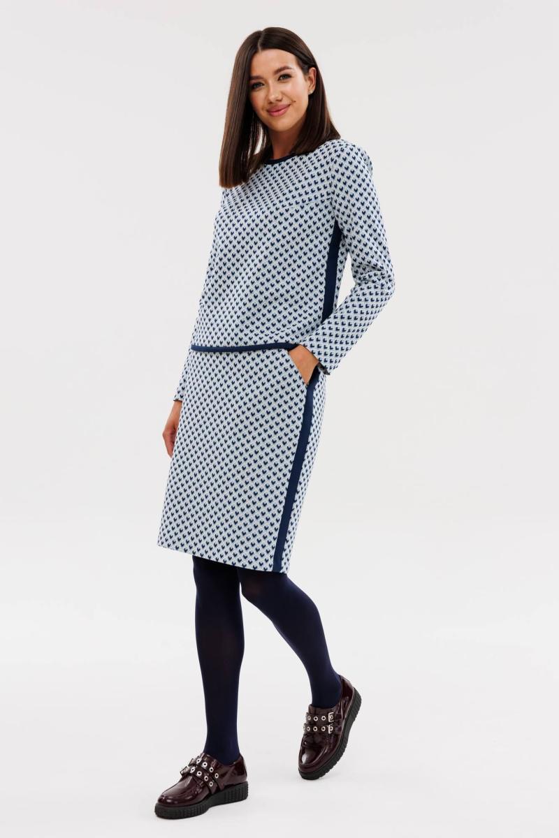 Стильный юбочный комплект из трикотажного полотна. Блузон прилегающего силуэта, по низу притачная планка из отделочной ткани, шириной 1,2 см. Потрясающе подчёркивает изящество фигуры боковая вставка, шириной 2,7 см из отделочной ткани. Горловина переда блузона обработана притачной планкой из отделочной ткани, шириной 1,2 см. Рукав втачной, одношовный. Спинка блузона с талевыми и вытачками, располагающимися в горловине. По среднему шву спинки расположена металлическая тесьма-молния. Юбка прилегающего силуэта, зауженная к низу, на кокетке. С боковыми наклонными карманами. С боковой вставкой, шириной 2,7 см, из отделочной ткани. По среднему шву потайная застёжка-молния, внизу разрез. Верхний край юбки обработан обтачкой. Юбка на подкладке. Комплект очень выгодно подчёркивает женские формы и прекрасно формирует силуэт, придавая ему столь желанное сходство с песочными часами!