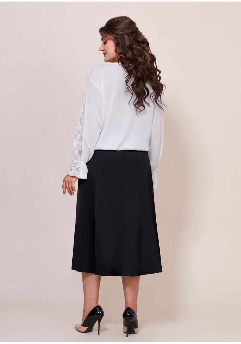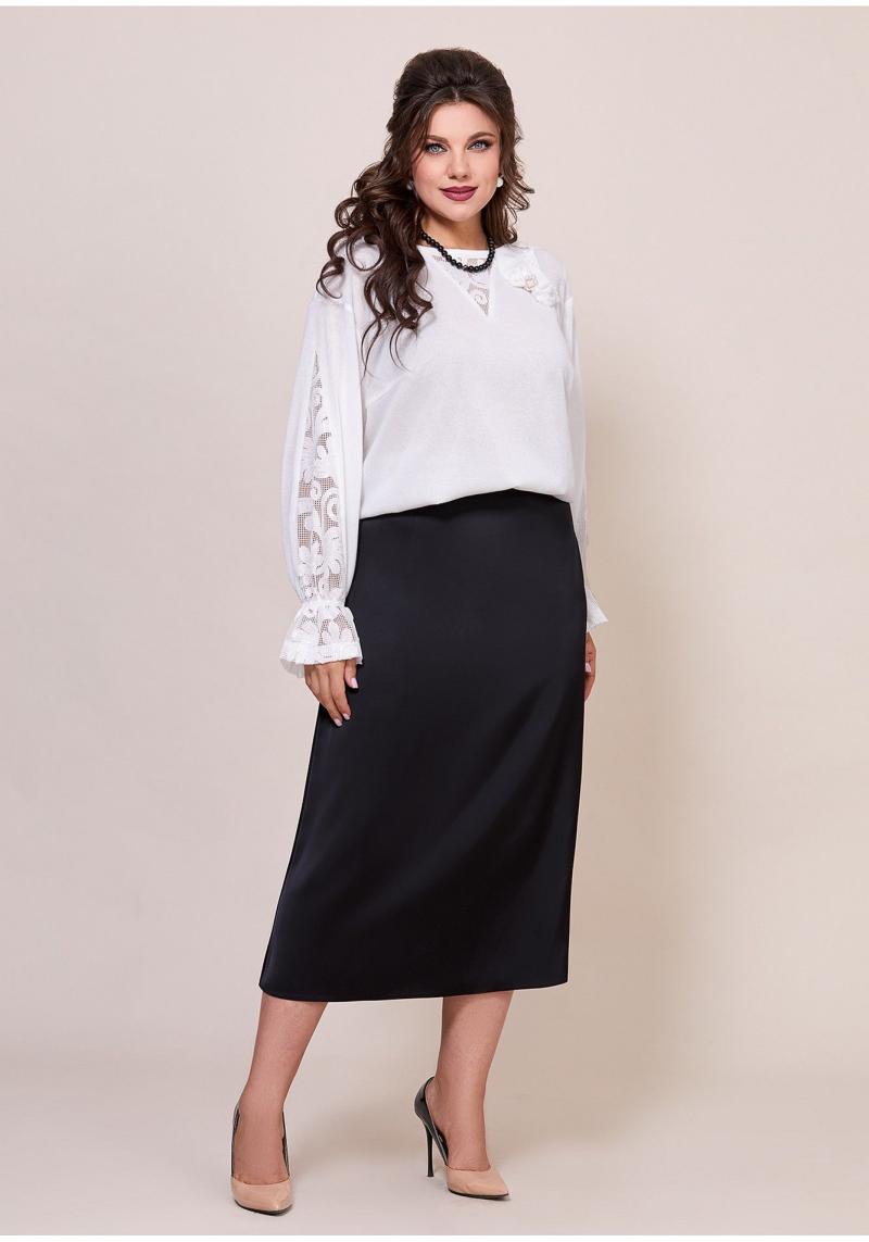 Женский комплект, состоит из юбки и блузки. Юбка выполнена из плотного атласа, по переду обработаны вытачки. Сзади юбка состоит из клиньев, верхний срез обработан притачным поясом, застежка по среднему шву на потайную молнию. Блузка выполнена из трикотажного полотна с вставками из сетки с кружевом. Горловина платья округлой формы, по полочке обработана вставка из сетки с кружевом, окантована. Рукав втачной, длинный, с вставкой из сетки с кружевом, по низу на резинке. Спинка выполнена из основной ткани, вся блуза по низу на резинке, по полочке дополнительный декор в виде броши. Универсальный комплект для обладательниц роскошных форм, в нем вам будет комфортно и в то же время он отлично дополнит ваш образ!