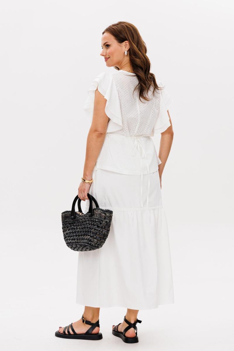 Костюм, состоящий из блузы и юбки. По переду блузы нагрудные вытачки, накладные карманы. Спинка с центральным швом. В боковых швах - завязки. Вырез горловины фигурный. Блузу украшают широкие воланы. Юбка на резинке, воланы, отделочная тесьма.