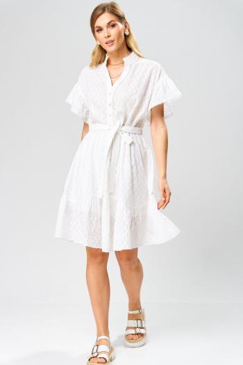 Комплект женский полуприлегающего силуэта состоит из жакета и юбки, выполнен из разных по дизайну тканей. Жакет укороченный, по переду талевые вытачки, прорезные карманы с листочками и застёжка на три прорезные петли и пуговицы, и три кнопки. Спинка с центральным швом и талевыми вытачками. Горловина круглая. Рукава двух шовные втачные на манжете. Жакет без подкладки. Дополняет комплект пояс с пряжкой.
