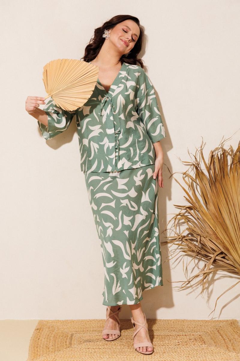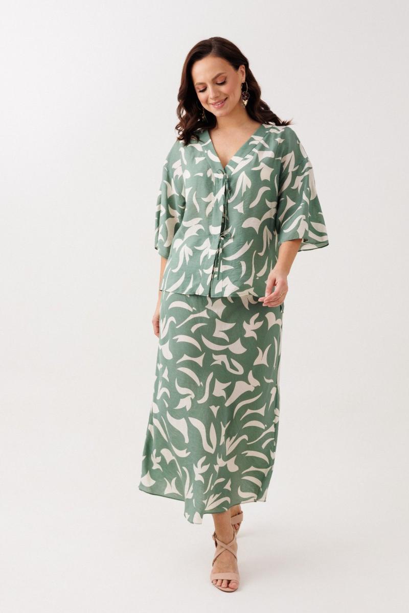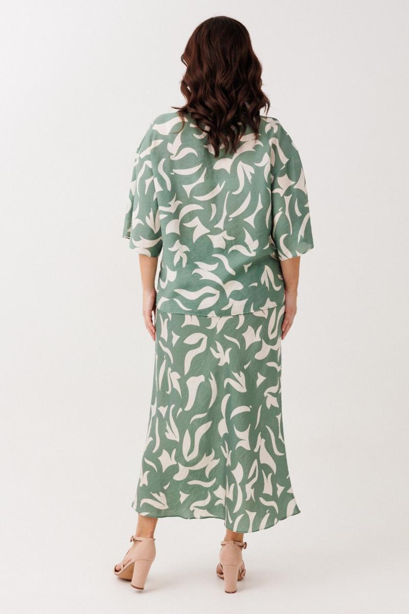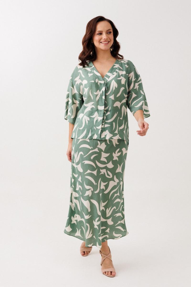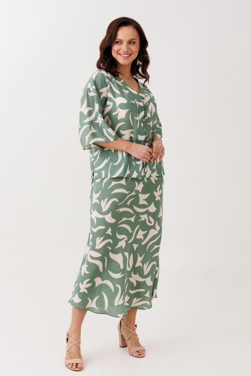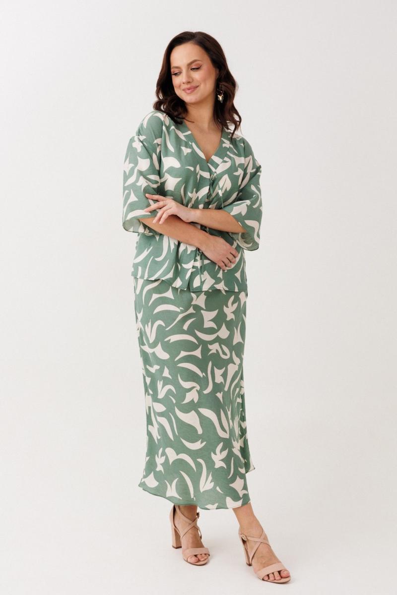 Нарядно-офисный костюм, состоящий из блузы и юбки, выполнен из легкой струящейся вискозы (не тянется). Блуза прямого силуэта со спущенной линией плеча, с застежкой-планкой на декоративные шнурки- завязки и пришивную кнопку. Вырез горловины V-образной формы. По боковым швам разрезы, низ прямой, разноуровневый по длине. Рукава одношовные, расширенные к низу. Юбка расширенная к низу. Верхний срез оформлен поясом с эластичной резинкой.