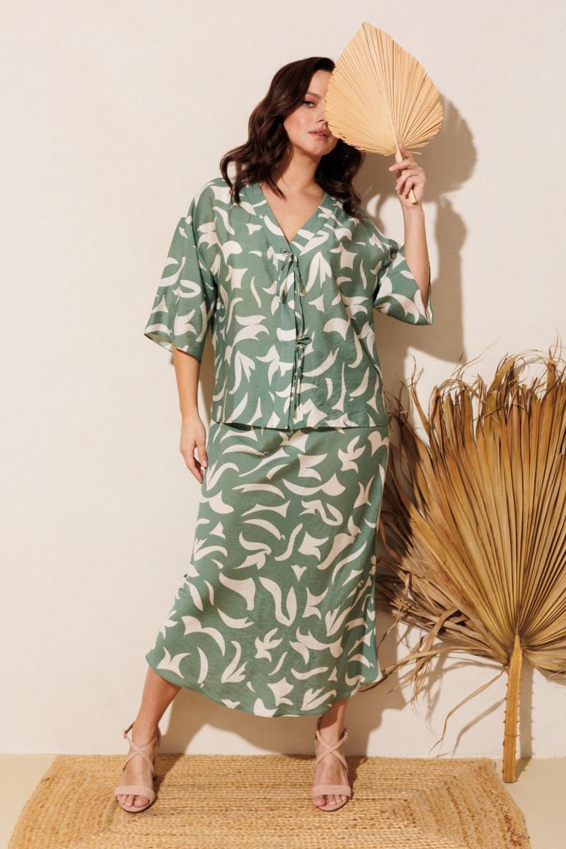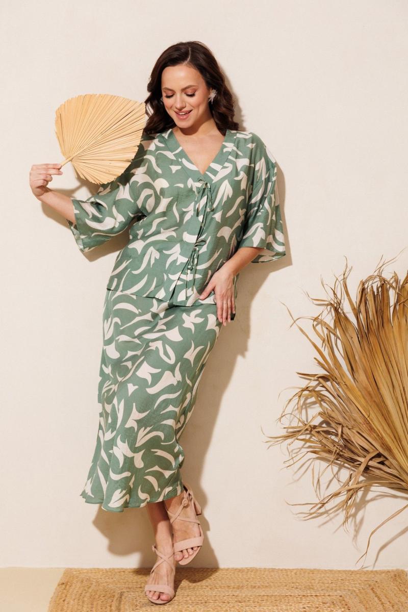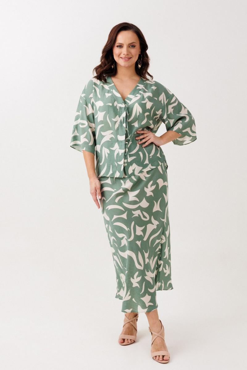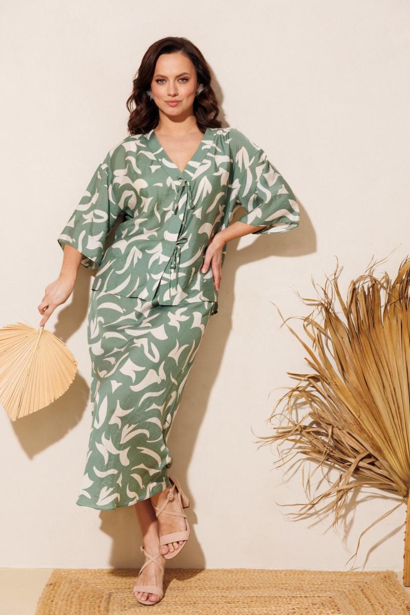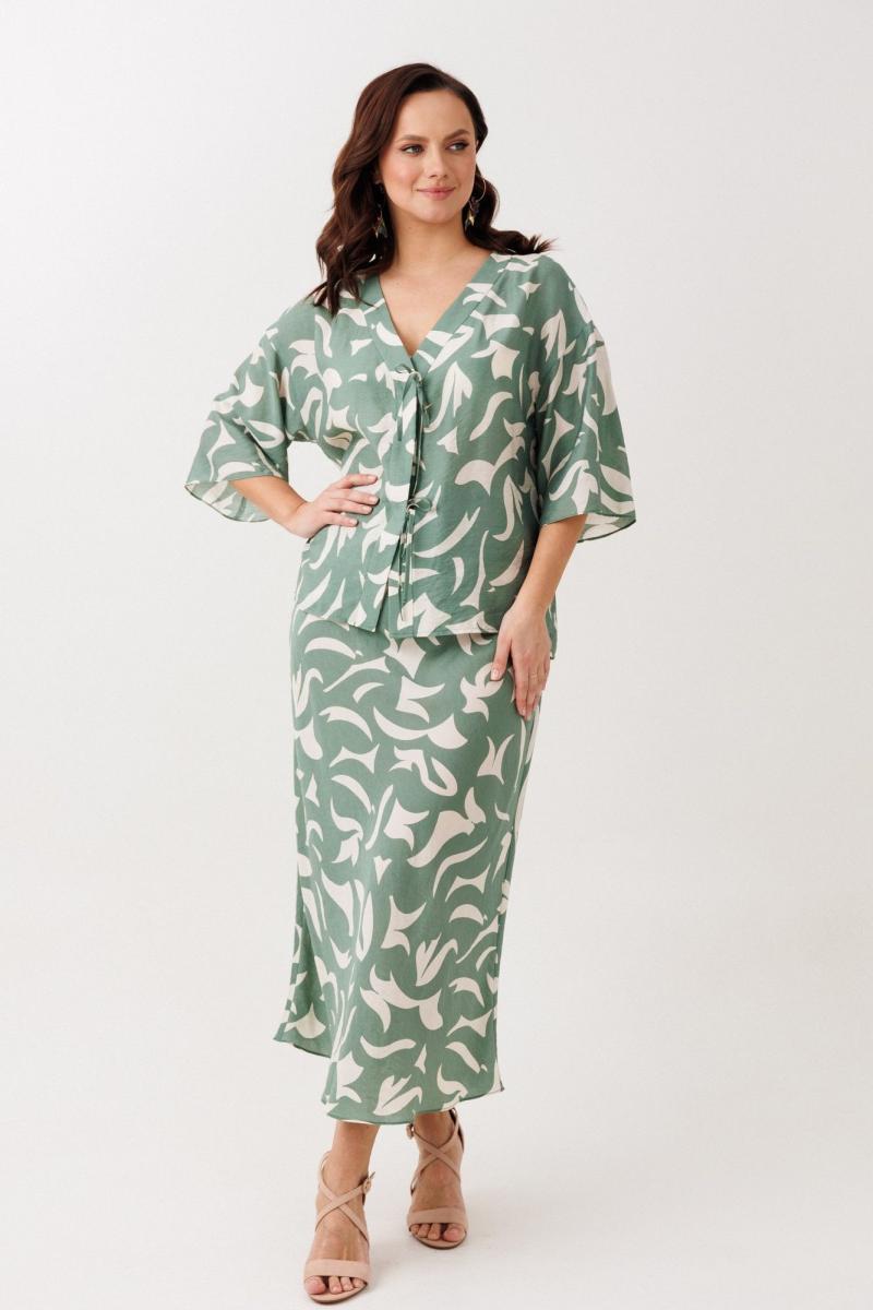 Нарядно-офисный костюм, состоящий из блузы и юбки, выполнен из легкой струящейся вискозы (не тянется). Блуза прямого силуэта со спущенной линией плеча, с застежкой-планкой на декоративные шнурки- завязки и пришивную кнопку. Вырез горловины V-образной формы. По боковым швам разрезы, низ прямой, разноуровневый по длине. Рукава одношовные, расширенные к низу. Юбка расширенная к низу. Верхний срез оформлен поясом с эластичной резинкой.
