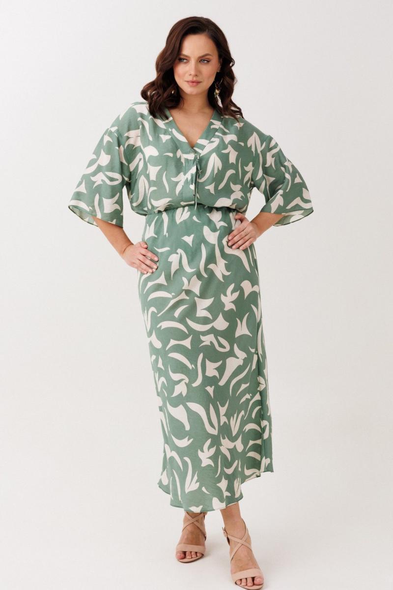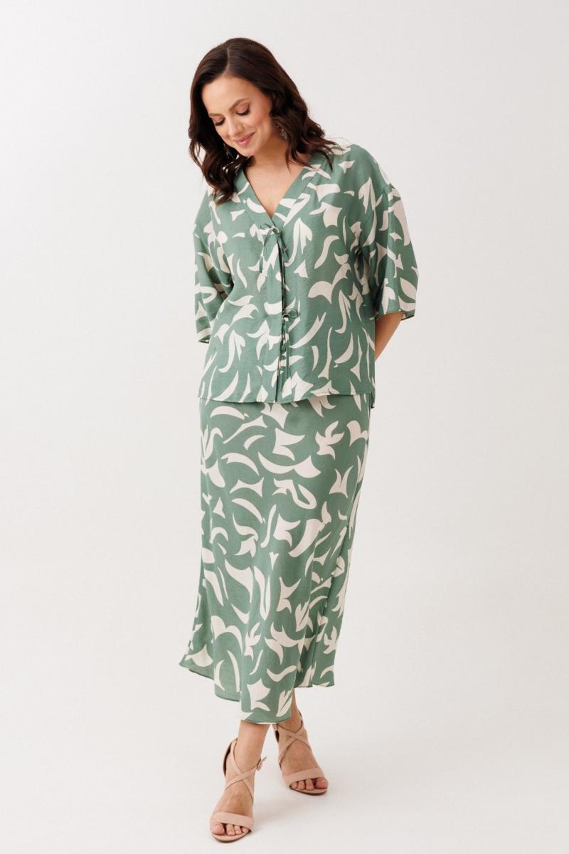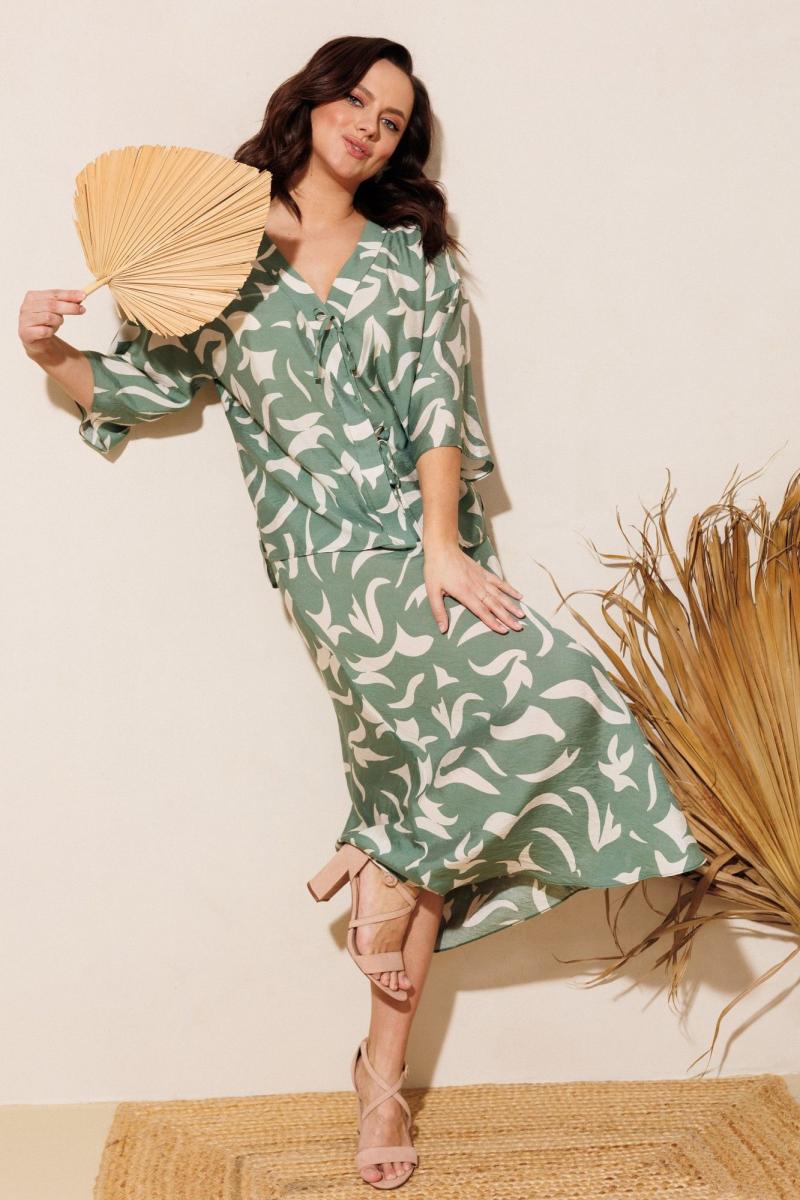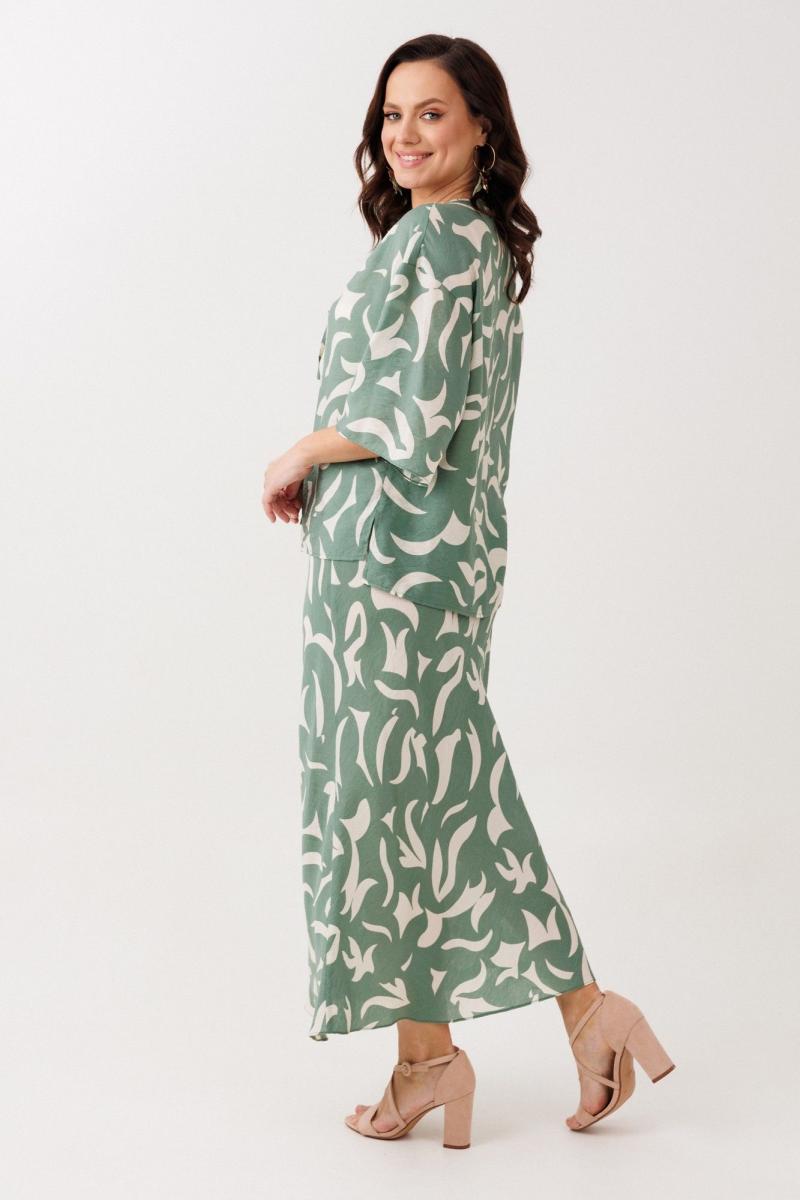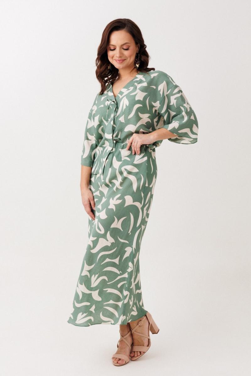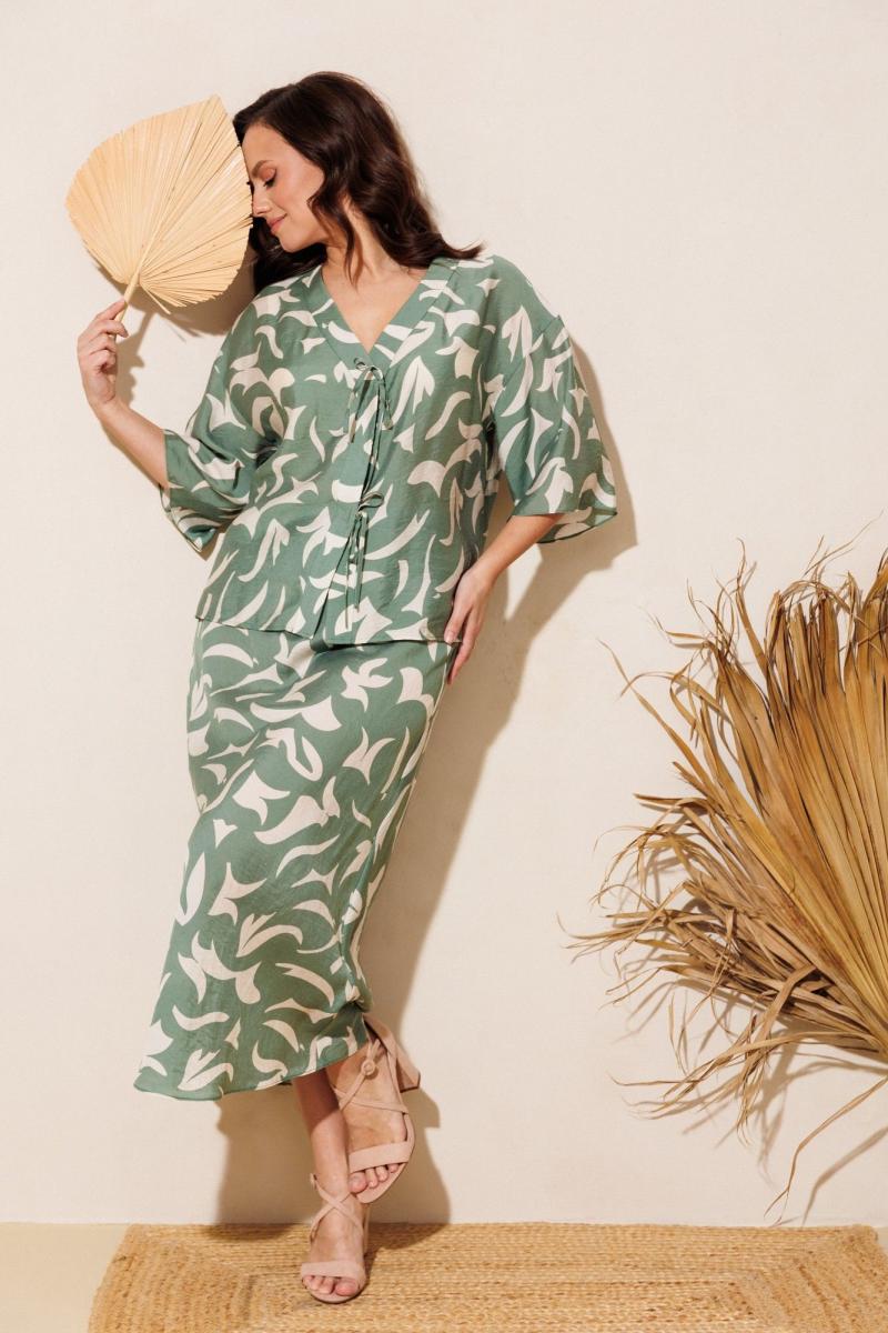 Нарядно-офисный костюм, состоящий из блузы и юбки, выполнен из легкой струящейся вискозы (не тянется). Блуза прямого силуэта со спущенной линией плеча, с застежкой-планкой на декоративные шнурки- завязки и пришивную кнопку. Вырез горловины V-образной формы. По боковым швам разрезы, низ прямой, разноуровневый по длине. Рукава одношовные, расширенные к низу. Юбка расширенная к низу. Верхний срез оформлен поясом с эластичной резинкой.