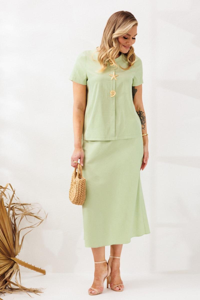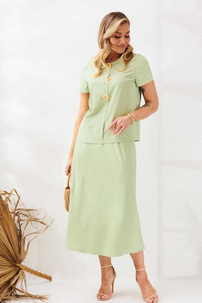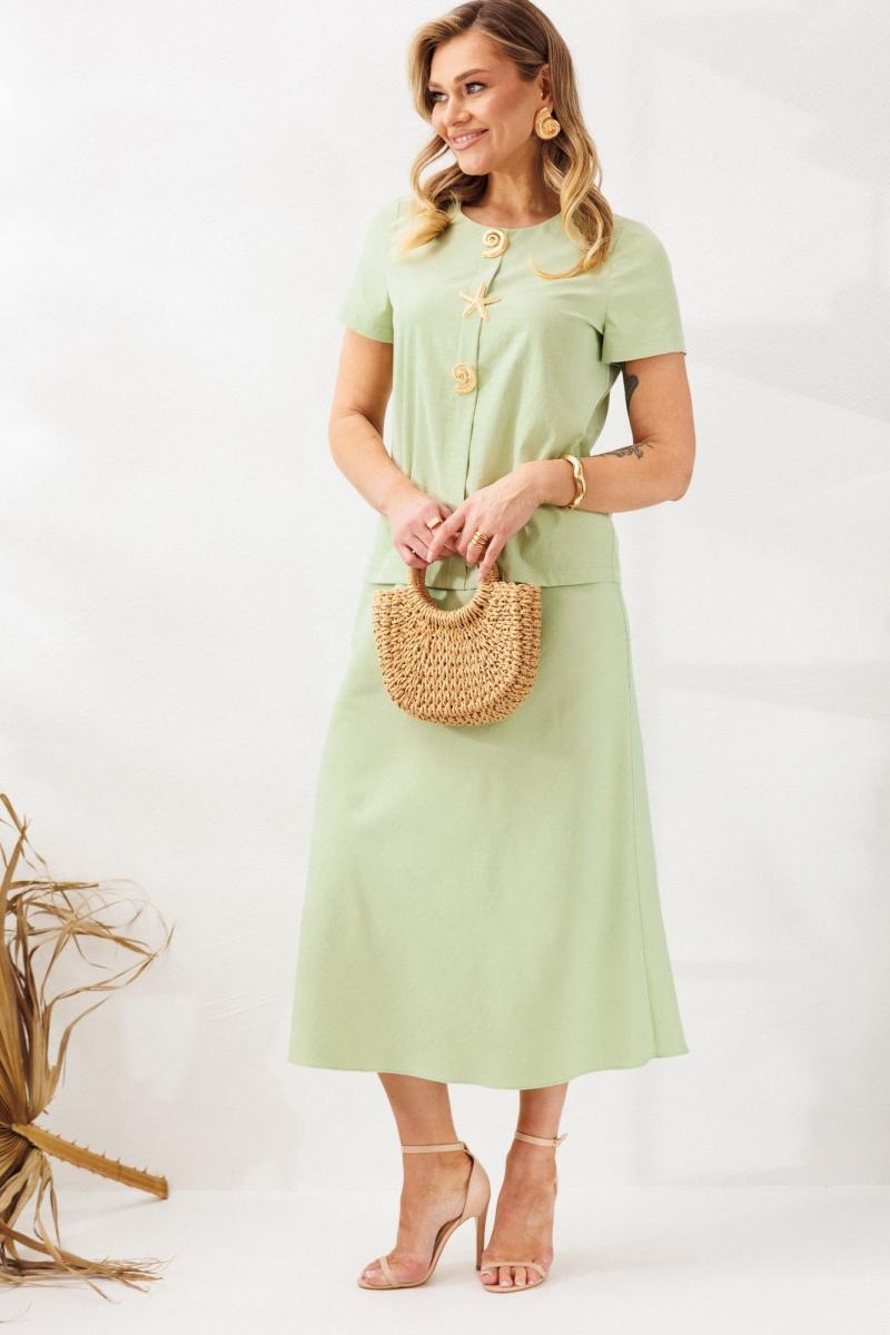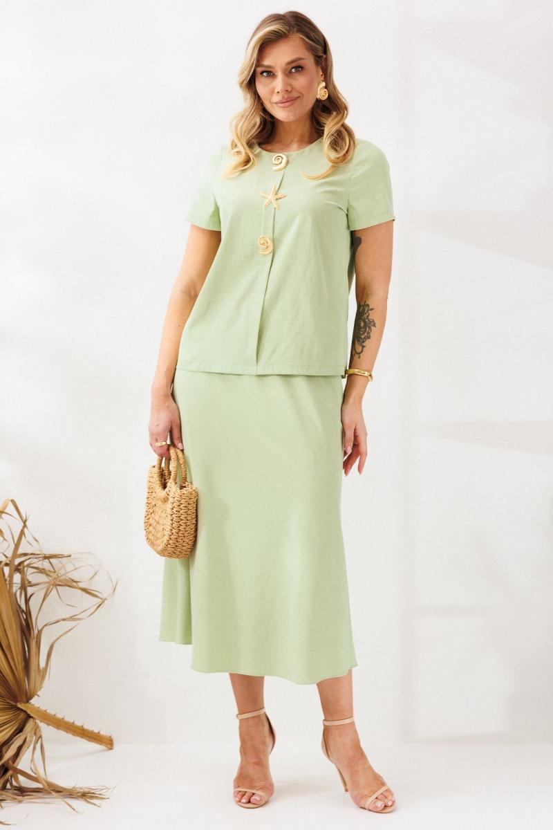 Нарядный женский костюм, состоящий из блузы и юбки, выполнен из костюмно-плательной ткани (тянется). Блуза прямого свободного силуэта. По переду отделочная складка с декором в виде 3-х съемных брошей. По спинке средний шов. Горловина округлой формы. Рукава втачные, одношовные. Юбка расширенная к низу. Верхний срез оформлен поясом с эластичной резинкой. Юбка без подкладки.