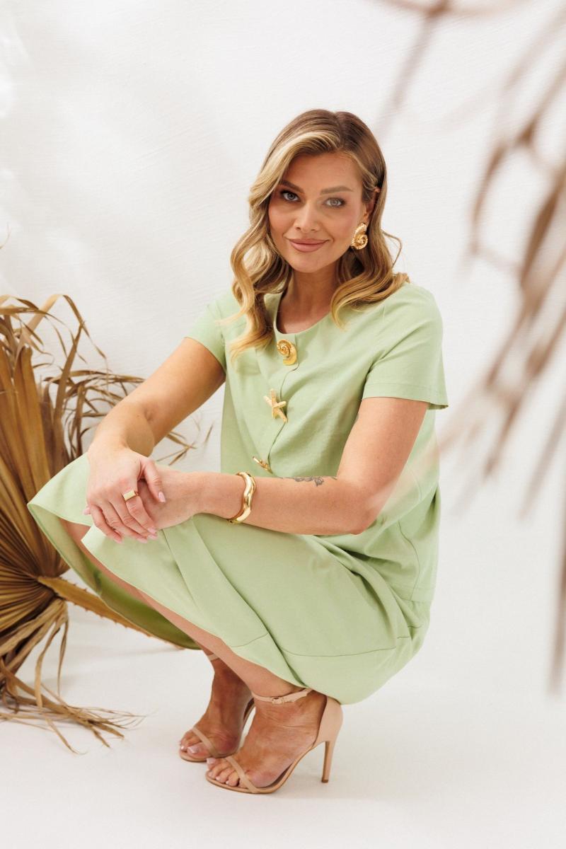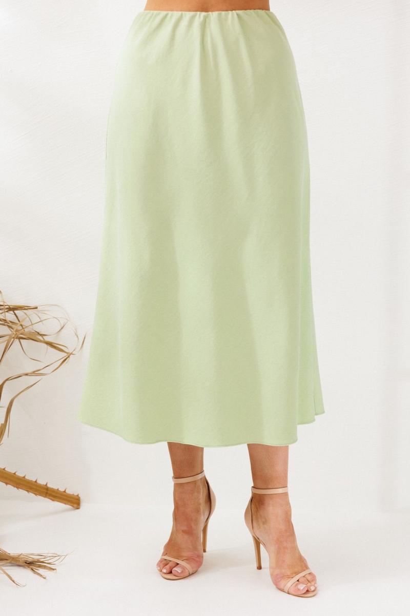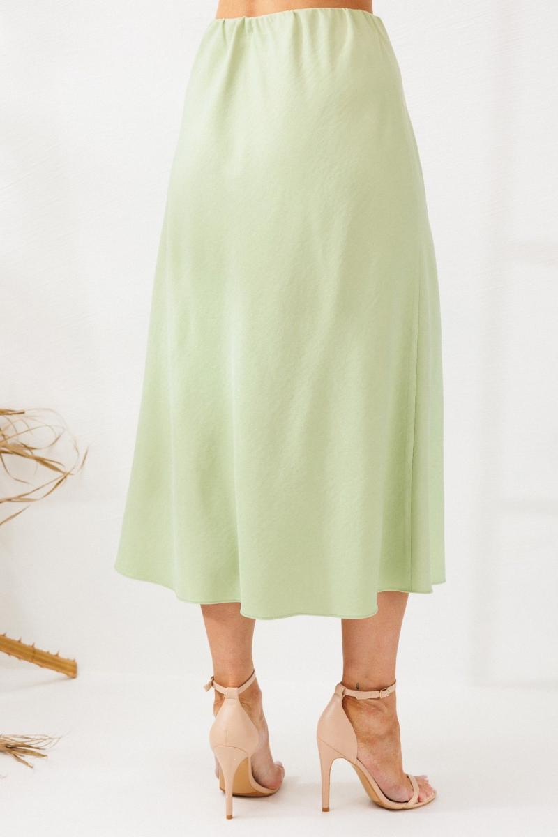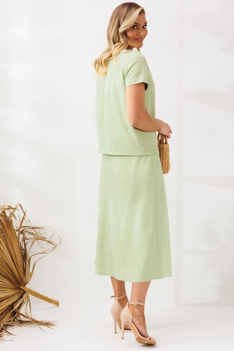Нарядный женский костюм, состоящий из блузы и юбки, выполнен из костюмно-плательной ткани (тянется). Блуза прямого свободного силуэта. По переду отделочная складка с декором в виде 3-х съемных брошей. По спинке средний шов. Горловина округлой формы. Рукава втачные, одношовные. Юбка расширенная к низу. Верхний срез оформлен поясом с эластичной резинкой. Юбка без подкладки.