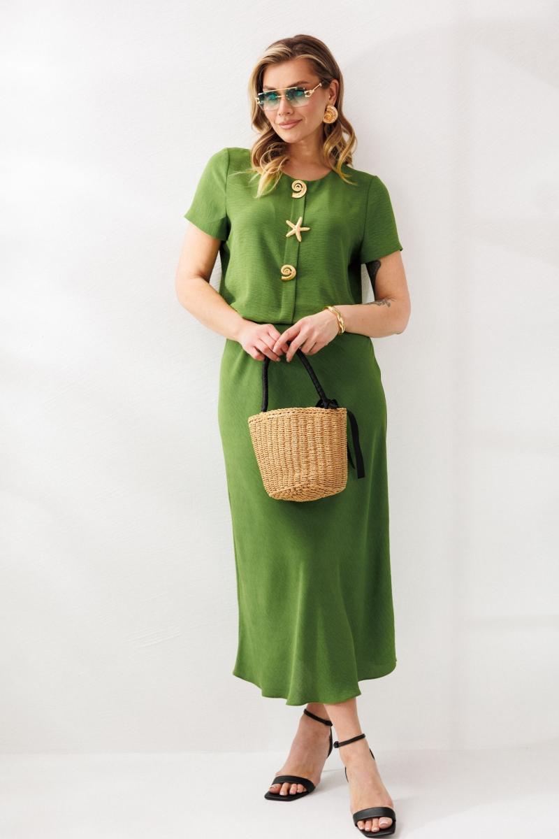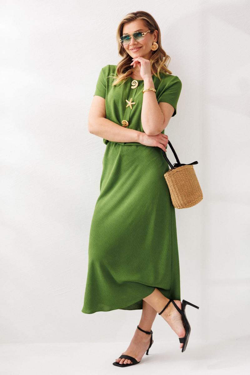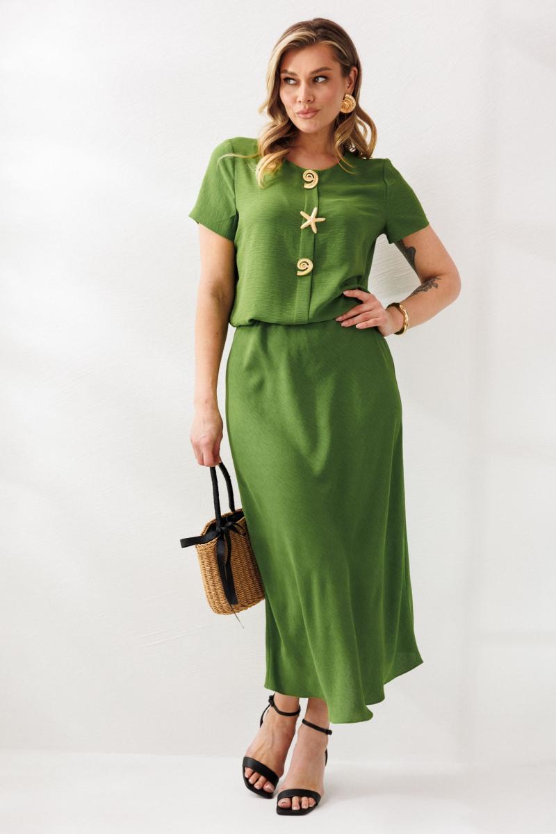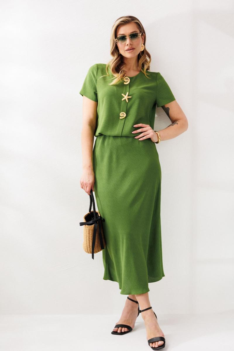 Нарядный женский костюм, состоящий из блузы и юбки, выполнен из костюмно-плательной ткани (тянется). Блуза прямого свободного силуэта. По переду отделочная складка с декором в виде 3-х съемных брошей. По спинке средний шов. Горловина округлой формы. Рукава втачные, одношовные. Юбка расширенная к низу. Верхний срез оформлен поясом с эластичной резинкой. Юбка без подкладки.