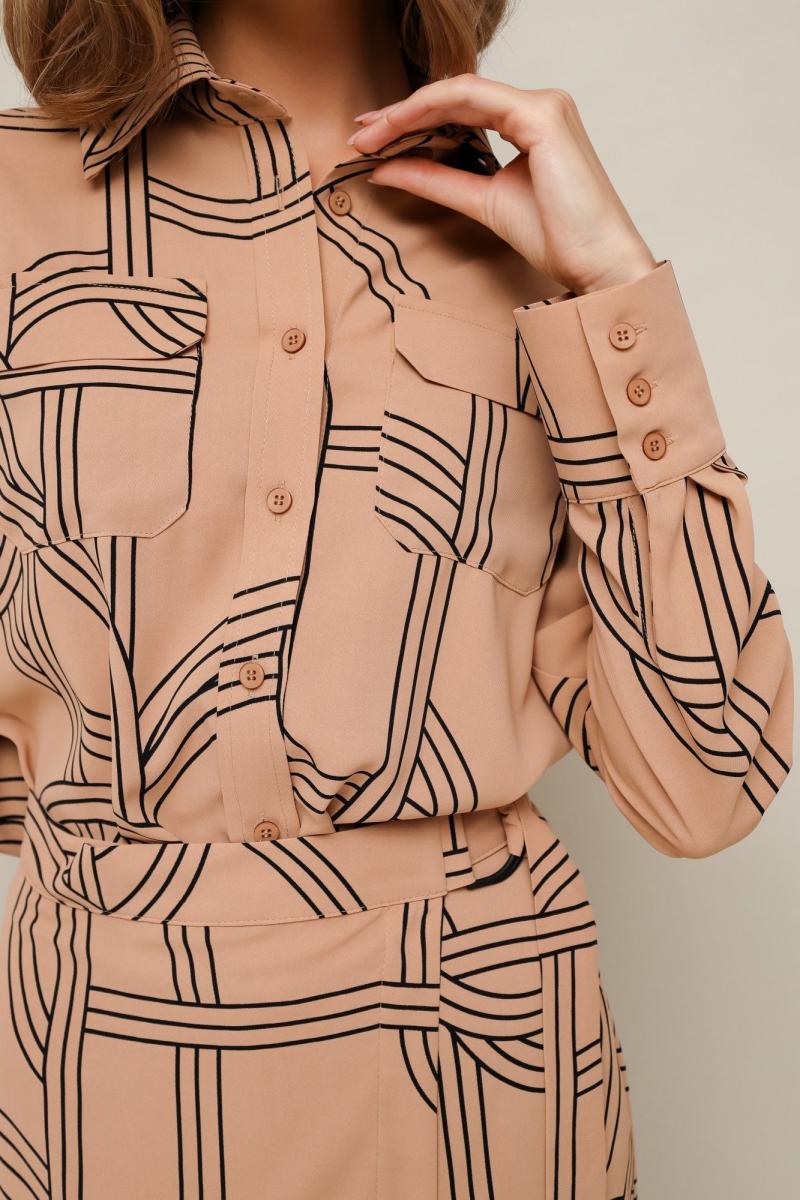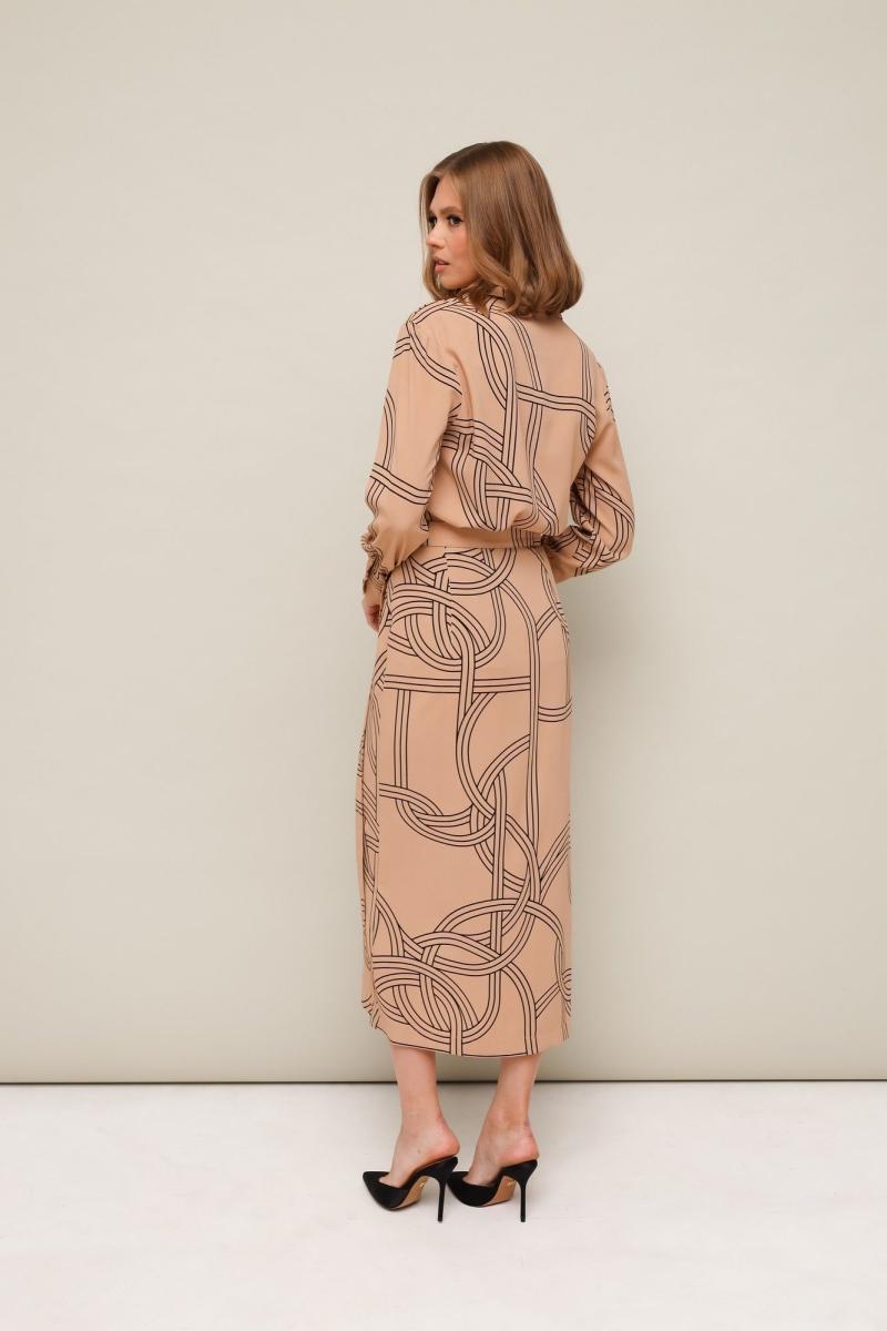 Комплект 2-предметный, состоящий из блузки и юбки на запах. Блузка прямого кроя, горловина обработана воротником на стойке, застежка на притачной планке на петли и пуговицы. Перед блузки с накладными карманами с клапанами. Рукава длинные с притачной манжетой с застежкой на пуговицы. В боковых швах обработаны разрезы. Юбка на запах в длине миди. Притачной пояс с застежкой на полукольца, внутри фиксируется на пришивные кнопки.