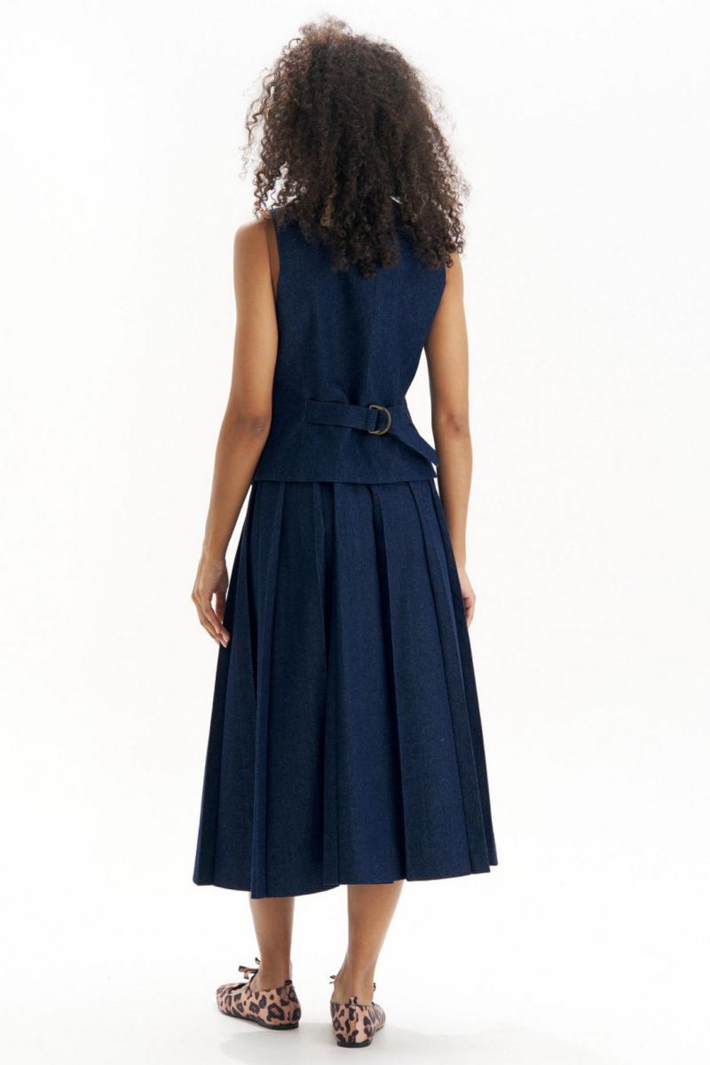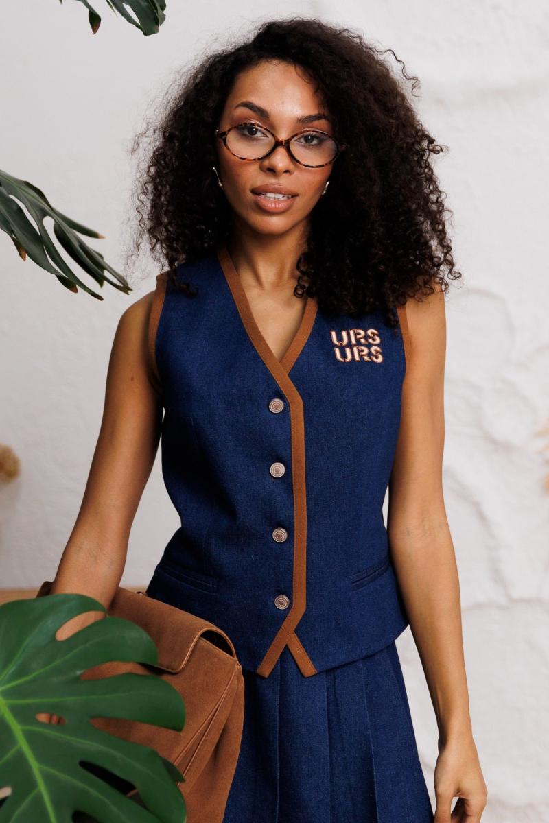 Этот костюм — настоящий манифест современной женственности. Приталенный жилет без рукавов выполнен из плотного тёмно-синего денима и украшен лаконичной вышивкой URS в стиле varsity, которая отсылает к эстетике университетской моды. Контрастная отделка в карамельном оттенке и стильные пуговицы добавляют акценты и создают архитектурный силуэт.
