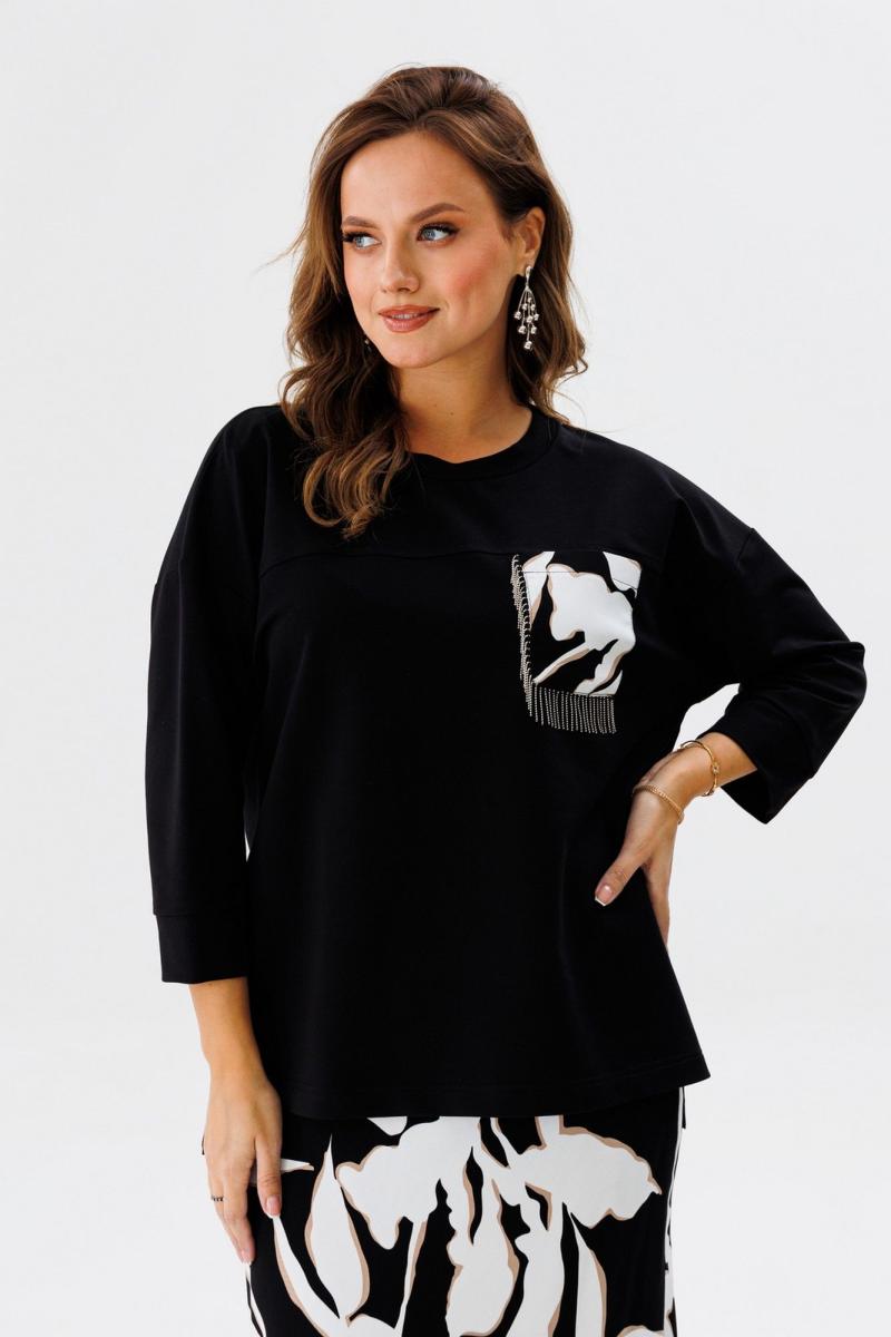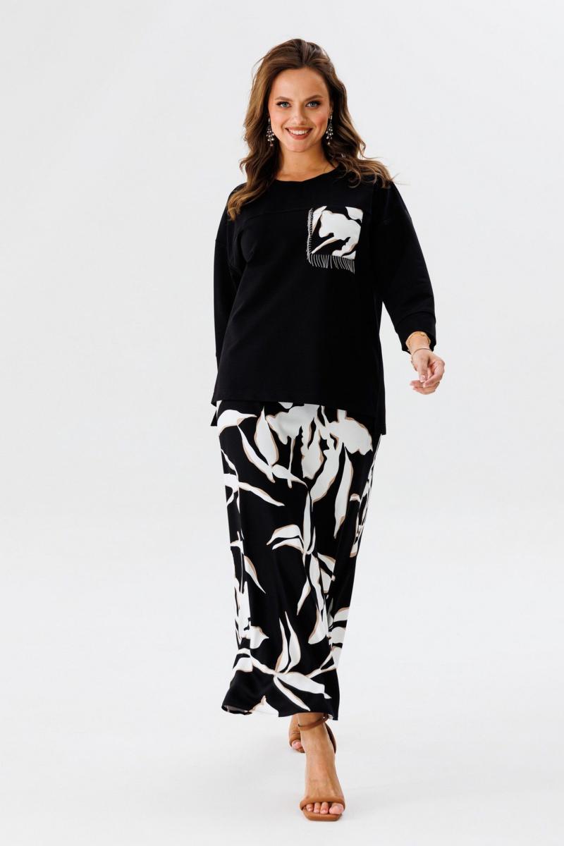 Комплект женский состоит из свитшота и юбки. Свитшот свободного покроя со спущенной линией плеча. Перед с отрезной кокеткой и накладным карманом с декоративной тесьмой. Рукав 3/4 с манжетой по низу. Горловина округлой формы, обработана эластичной бейкой. Юбка А-образного силуэта типа "колокол". Верх юбки обработан поясом с резинкой по спинке. Юбка на подкладке из 100% хлопка. Застежка в боковом шве на потайную молнию.