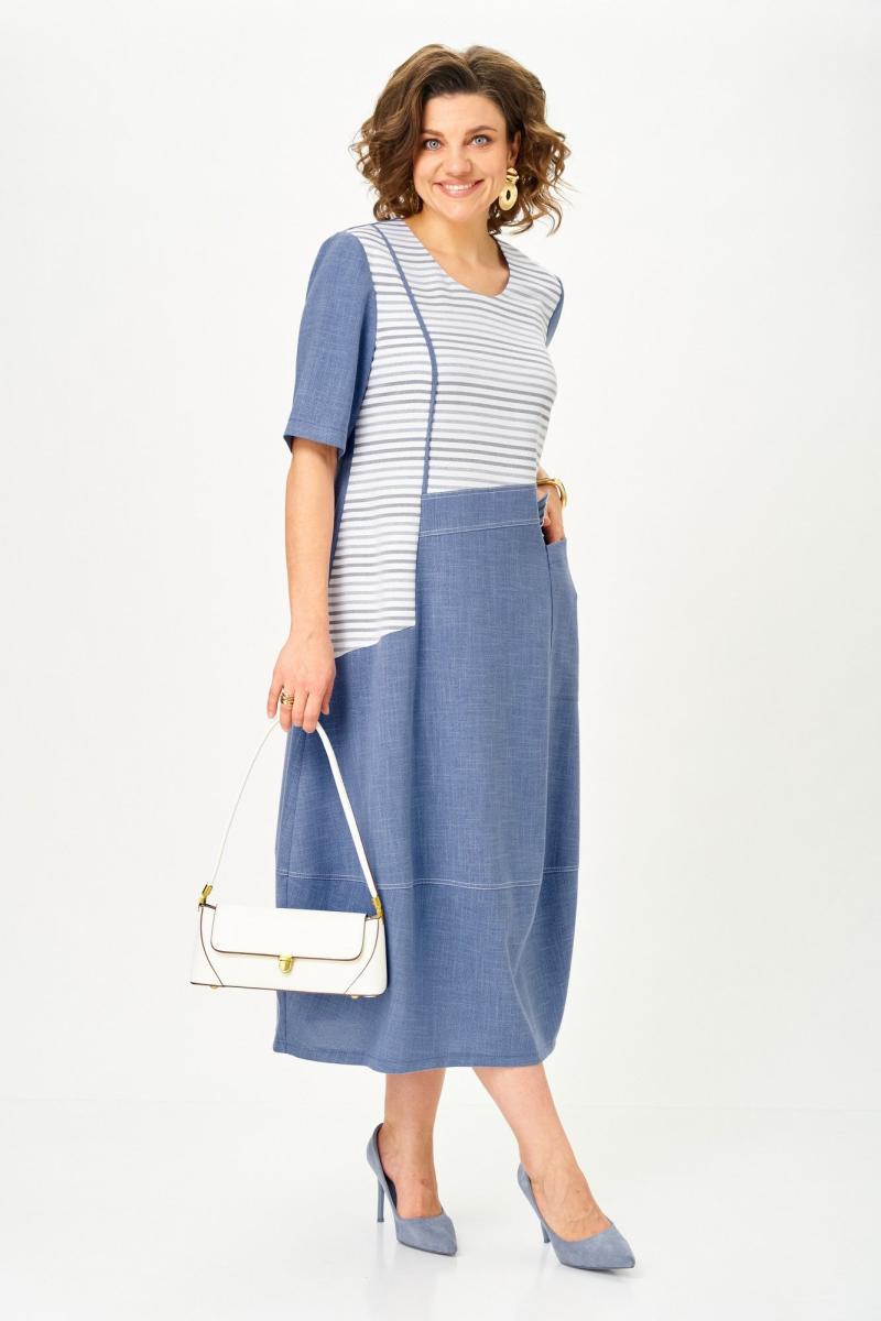 Платье повседневного назначения отличается оригинальным комбинированием тканей и асимметричным членением деталей. Модель свободного силуэта, длиной ниже колена, что обеспечивает комфорт и практичность в носке. Верхняя часть изделия выполнена из ткани в горизонтальную полоску, которая визуально придаёт образу динамичность и лёгкость. Перед асимметричного кроя, с конструктивным членением. Верхняя часть выполнена из ткани в горизонтальную полоску. Линия соединения деталей проходит по диагонали. На правой стороне переда расположен накладной карман прямоугольной формы. Нижняя часть платья изготовлена из однотонной ткани, создающей гармоничный контраст с верхом.