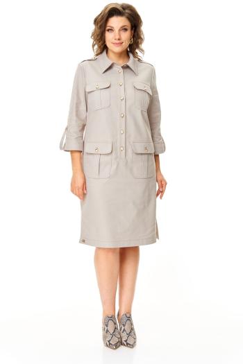 Платье женское полуприлегающего верху силуэта с расширением к низу, отрезное чуть ниже линии талии с фигурной линией, понизу с двумя притачными оборками, по шву соединения со сборкой, с застёжкой по среднему шву спинки на навесную петлю и пуговицу. Перед с нагрудными выточками. Спинка со средним швом. Рукава втачные, одношовные, длиной ¾, по центру с кулисой и продёргивающейся завязкой. Платье декорировано по переду аппликацией «круг» и съёмные отделочные шнуры с бусинами фиксируемые на два карабина.