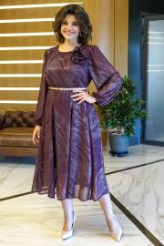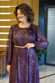 Платье полуприлегающего верху силуэта книзу годе, с застёжкой по среднему шву спинки на потайную молнию. Перед и спинка с рельефными швами. Рукава втачные, одношовные, длинные, по окату со сборкой по низу на резинке. Декорировано съёмным украшением, в дополнение ремень.