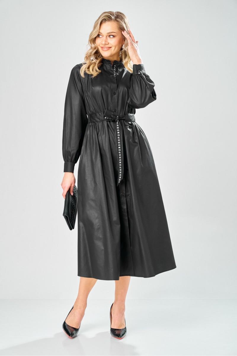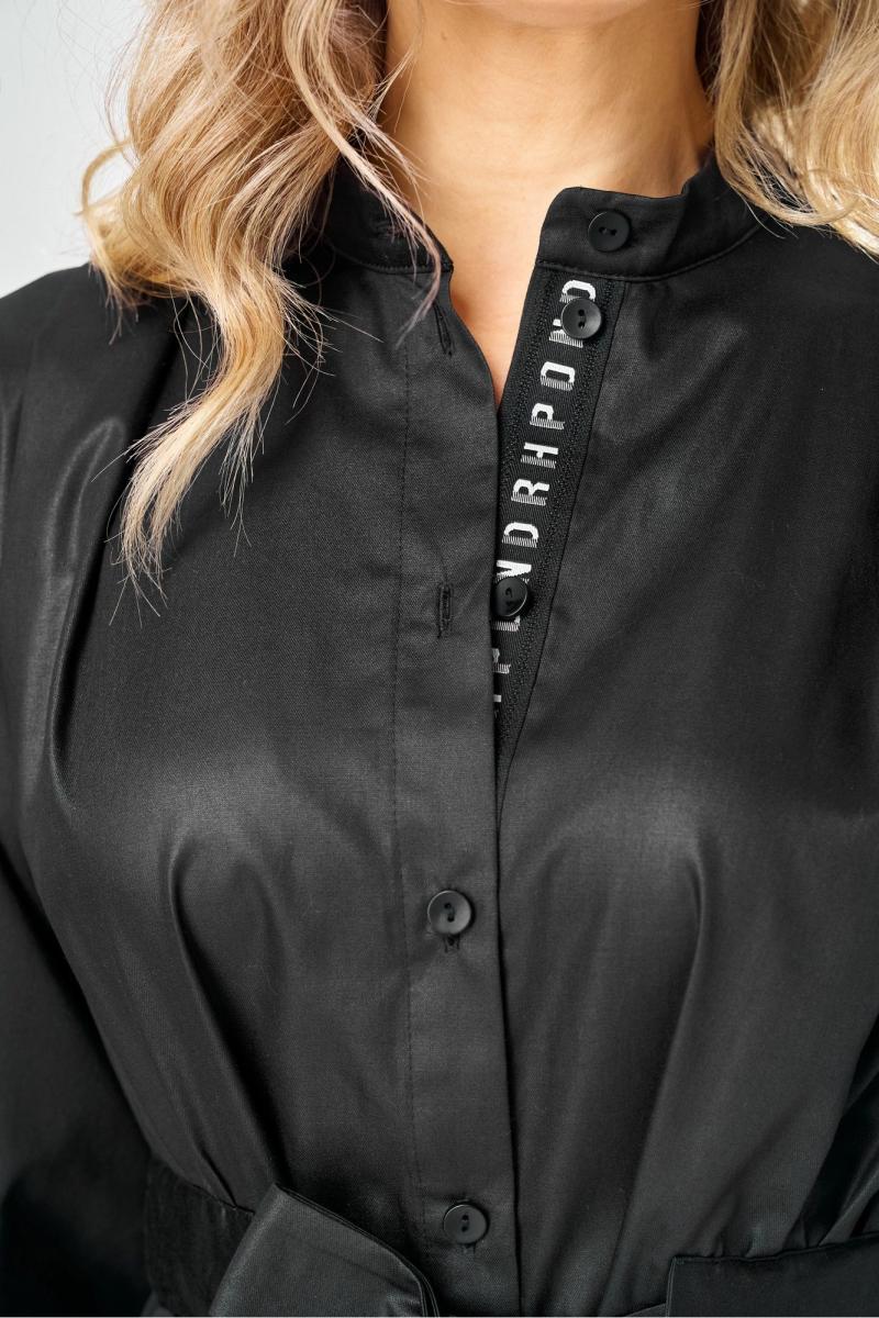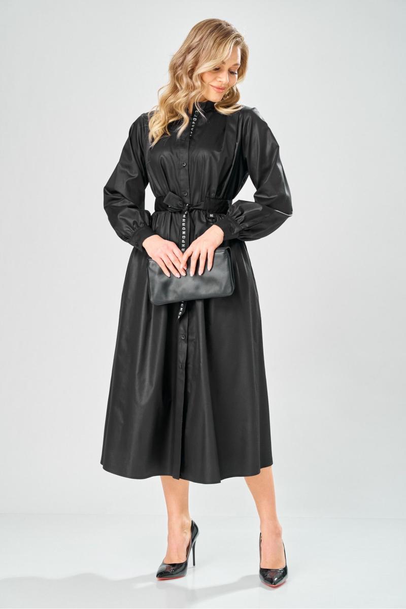 Платье миди Х-силуэта из эластичного хлопка. От плечевых швов заложены складки. По талии сзади и спереди платье присобрано на широкие планки в которые вдет пояс с декоративной тесьмой, формирующий женственные пропорции. Сквозная застежка на пуговицы зрительно вытягивает силуэт. Воротник-стойка. Классические манжеты на рукавах. Длина изделия - 126 см. Длина рукава -60 см.