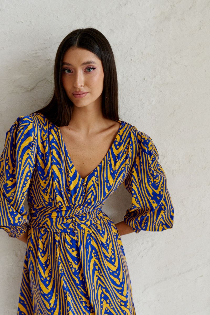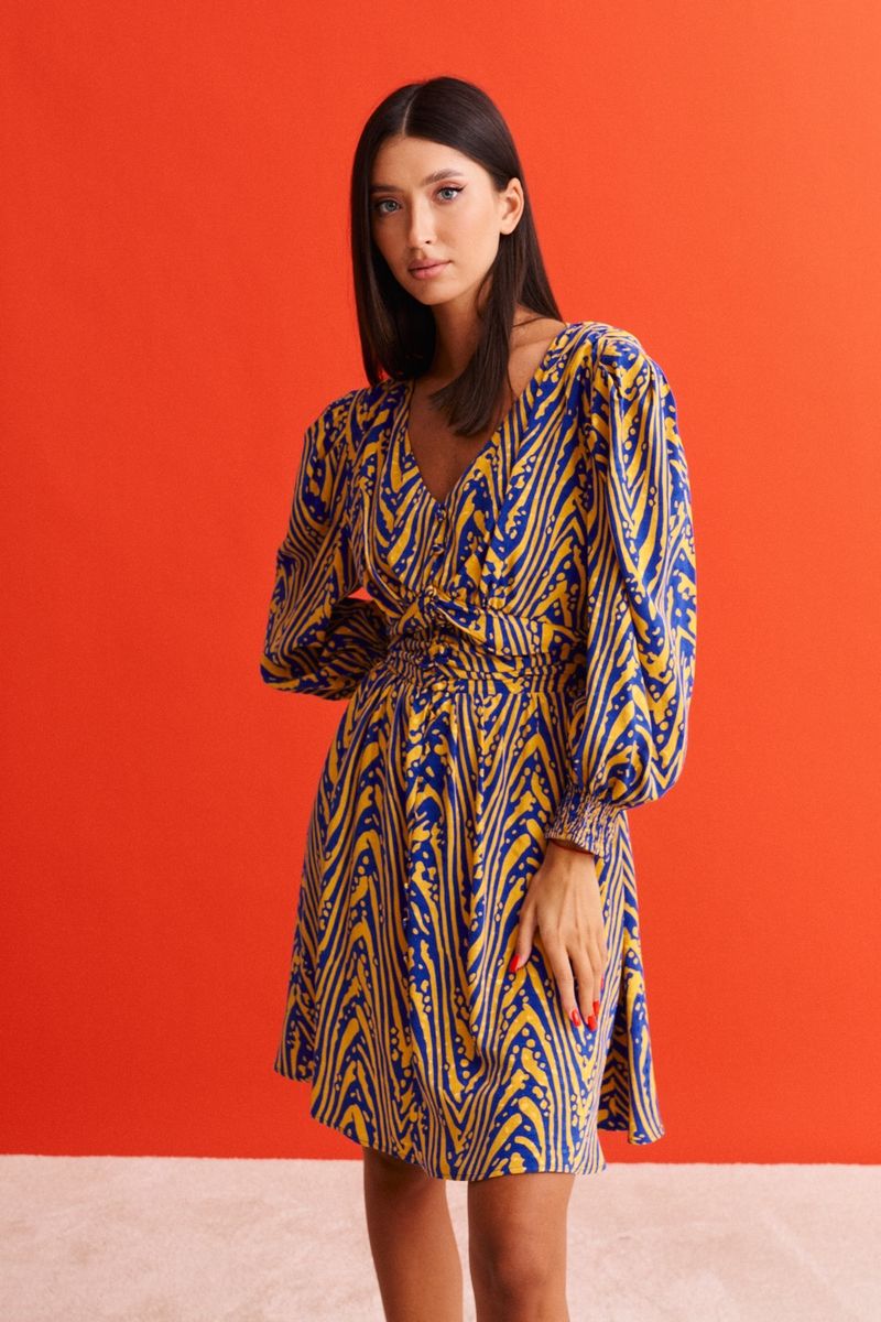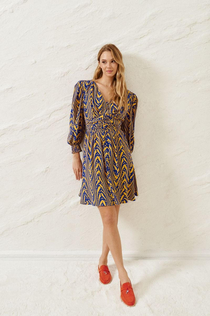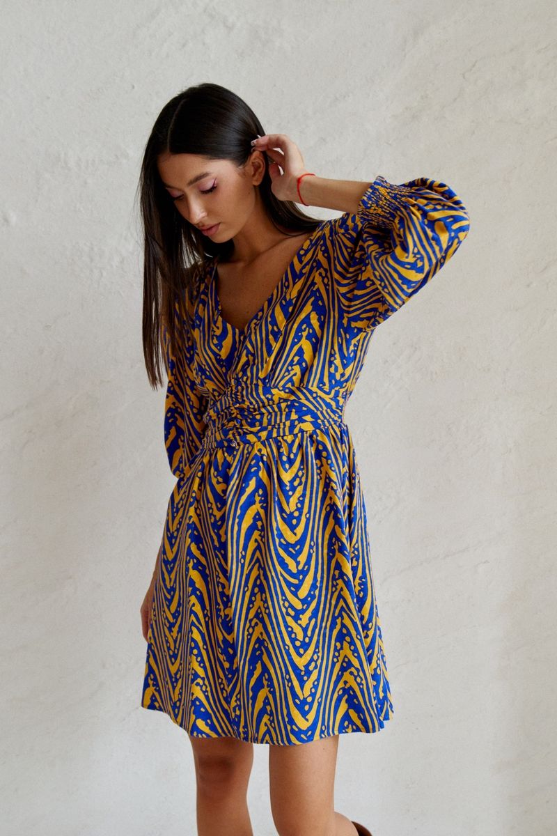 Платье полуприлегающего силуэта выполнено из полотна с абстрактным контрастным принятом. Характеристики: прилегающий силуэт, подкладка, отрезное, по отрезу фигурная вставка со сборкой, горловина V образный вырез, по переду изделия не функциональные пуговички, рукав втачной по низу рукава манжета на резинке, по спинке в области фигурной вставки - резинка венгерка, низ в изделии свободного кроя на подкладке. Длина изделия по спинке 90 см, длина рукава 57 см.