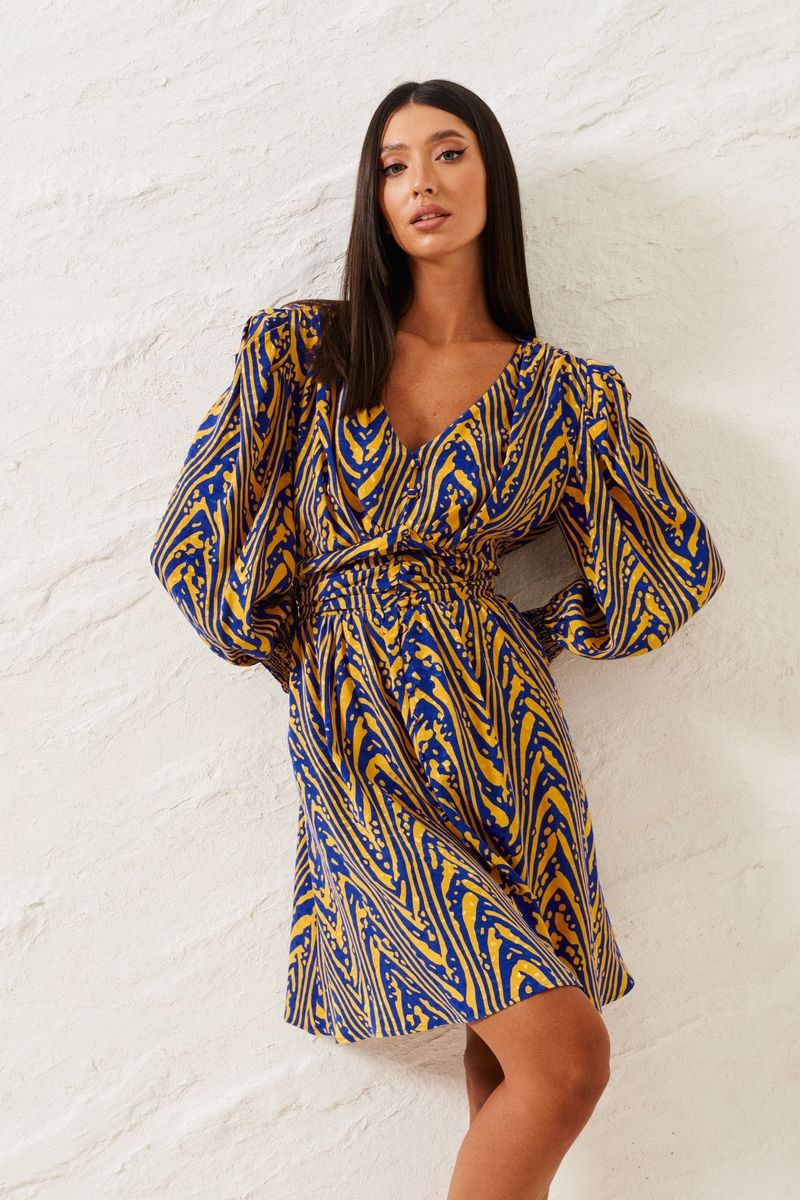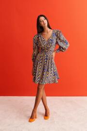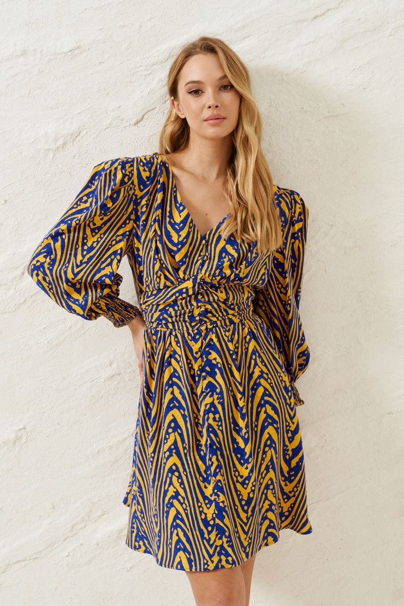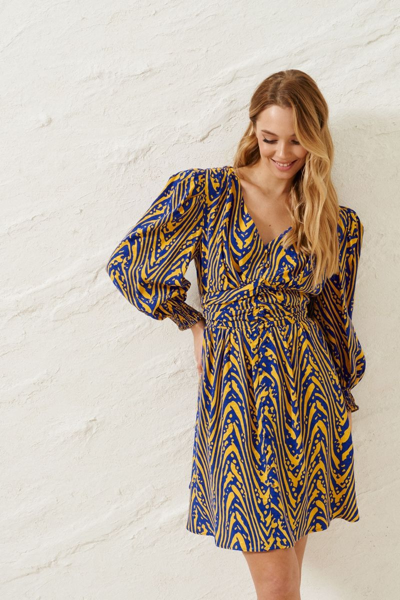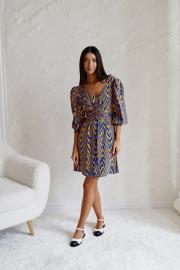 Платье полуприлегающего силуэта выполнено из полотна с абстрактным контрастным принятом. Характеристики: прилегающий силуэт, подкладка, отрезное, по отрезу фигурная вставка со сборкой, горловина V образный вырез, по переду изделия не функциональные пуговички, рукав втачной по низу рукава манжета на резинке, по спинке в области фигурной вставки - резинка венгерка, низ в изделии свободного кроя на подкладке. Длина изделия по спинке 90 см, длина рукава 57 см.