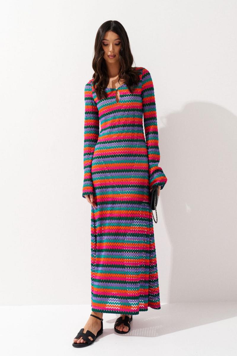 Платье полуприлегающего силуэта выполнено из ажурного полотна разных ярких цветов. Характеристики: полуприлегающий силуэт, подкладка, овальный вырез горловины, по переду разрез капелька с декоративной деревянной пуговичкой в виде сердца, рукав втачной. Длина по спинке 132, длина рукава 71см.