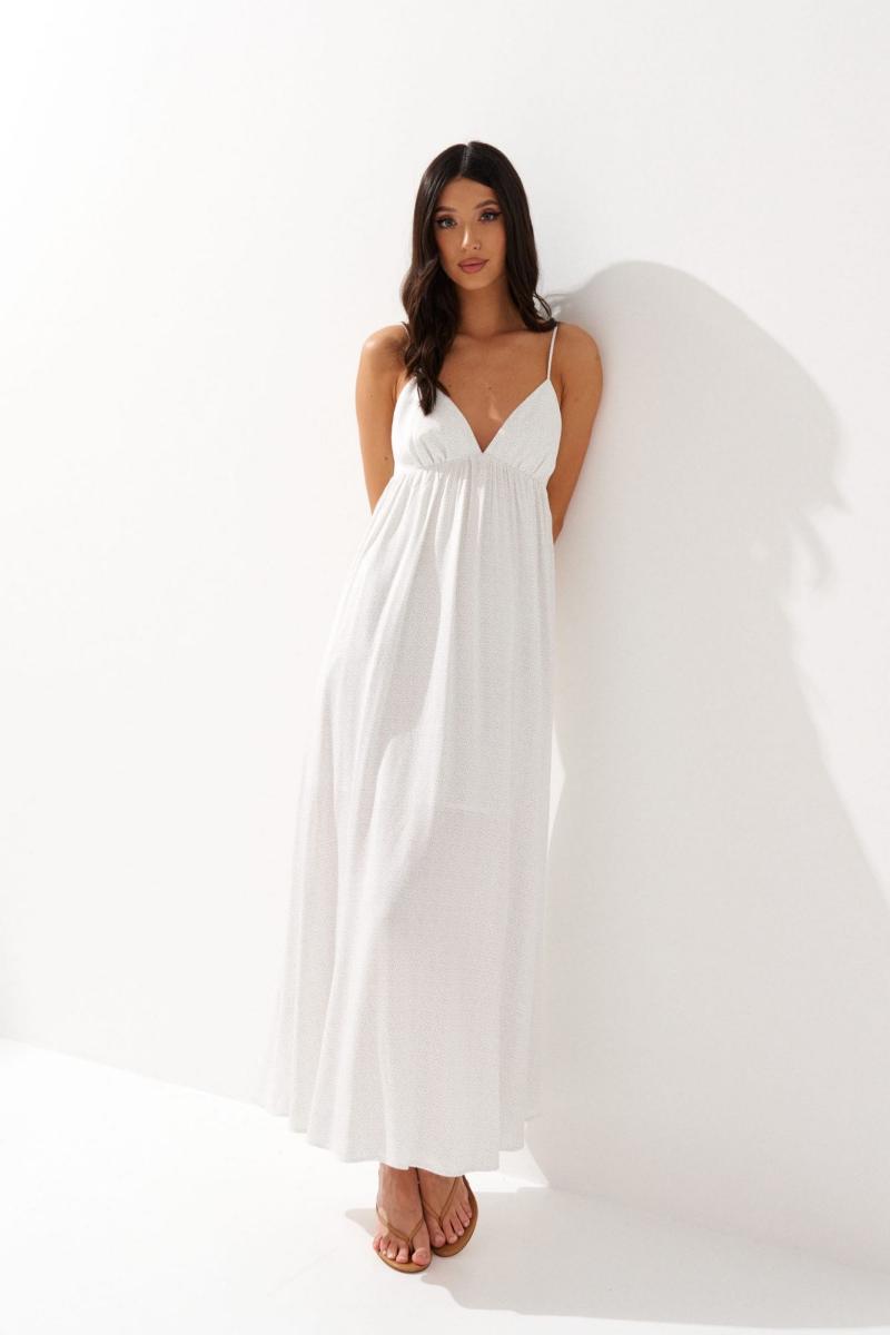 Платье на бретелях выполнено из белого полотна с принтом. Характеристики: полуприлегающий силуэт, отрезное, фигурный вырез горловины, нерегулируемые бретели, спинка частично на резинке. Длина 137 см.