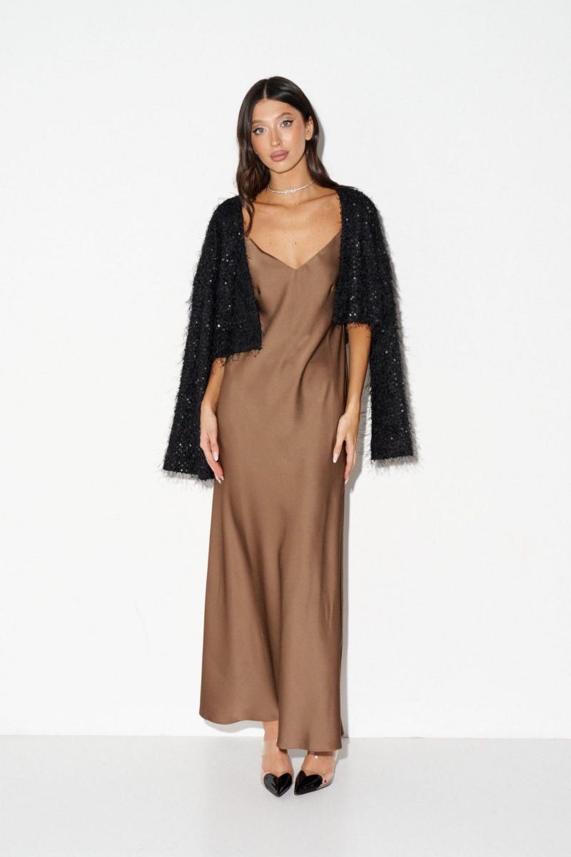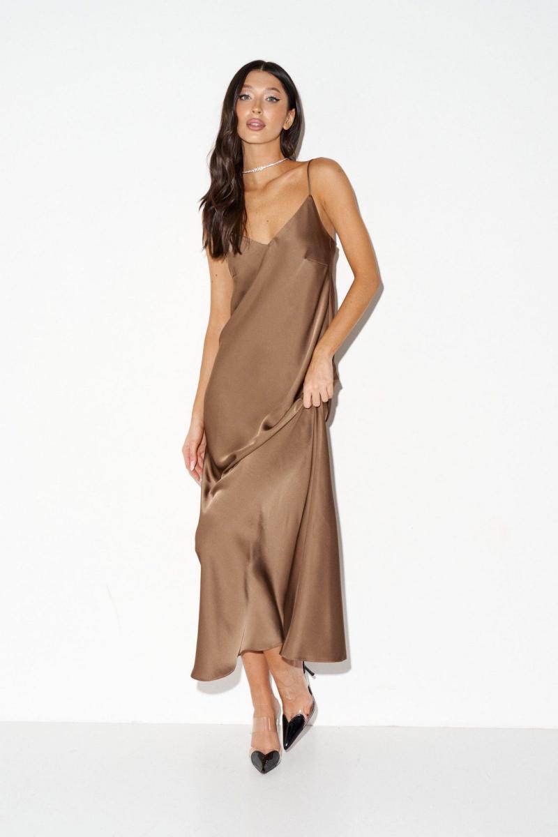 Платье на бретелях, полуприлегающего силуэта. Выполнено из сатиновой ткани бежевого цвета. Характеристики: полуприлегающий силуэт, регулируемые бретели, лиф фигурный с вытачками по переду, . Длина по спинке 114см.