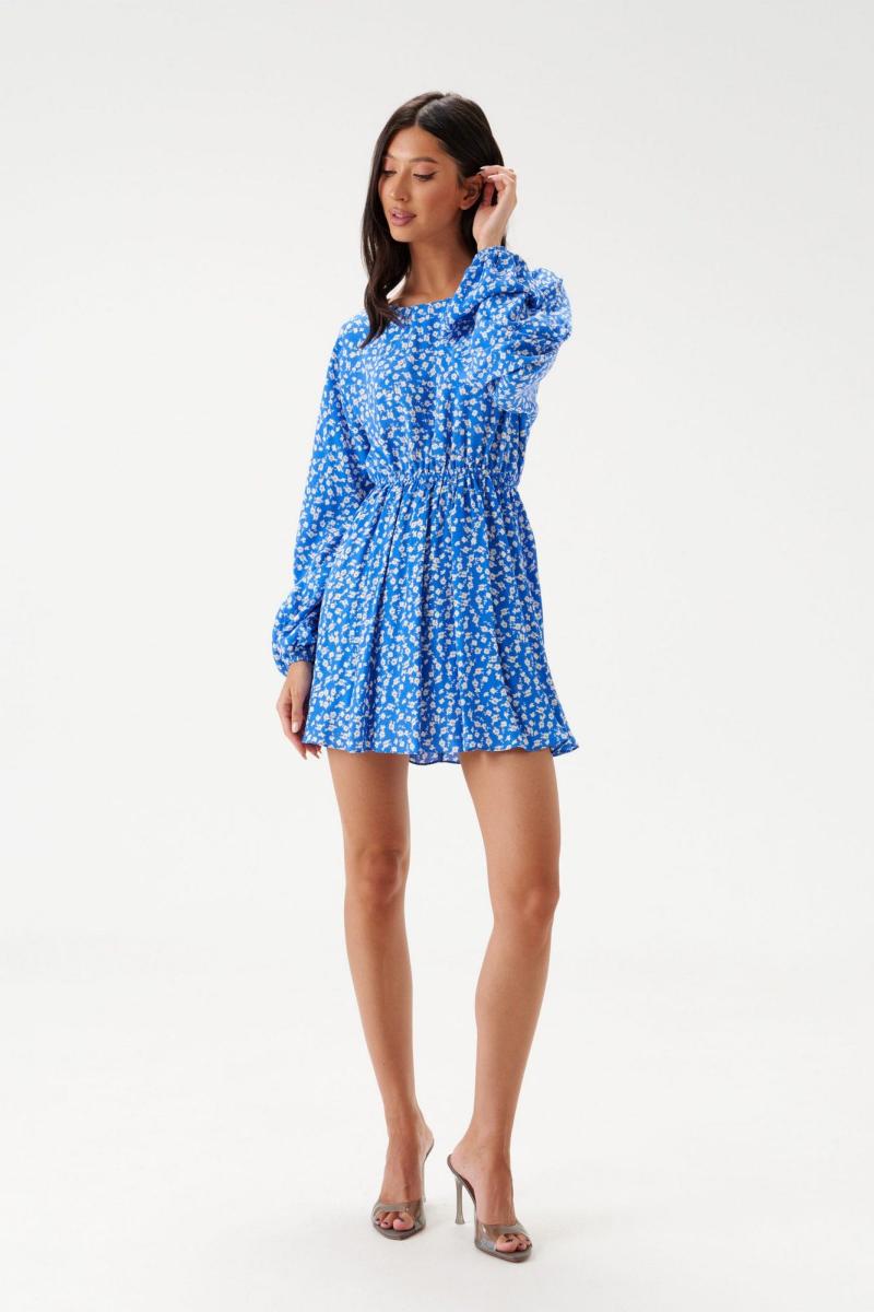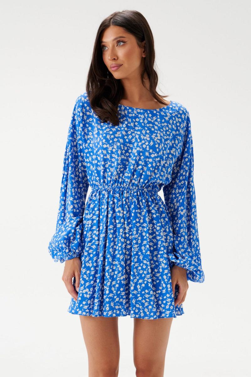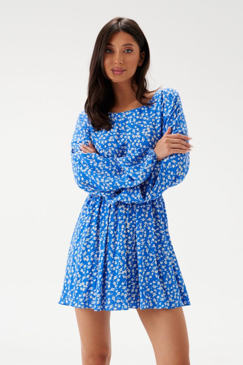 Платье - мини полуприлегающего силуэта выполнено из голубого полотна с белым цветочным принтом. Горловина овальная. Отрез ниже талии на резинке. По лифу спинки вырез с завязками. Рукав спущенный, присборен на резинку. Длина платья 84 см, длина рукава от горловины 76 см.