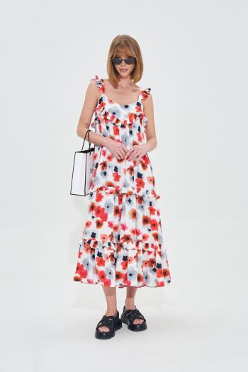 Платье женское летнее, полуприлегающего силуэта из хлопковой ткани двух видов. Горловина округлая. Рукав на полпроймы. Вверху на резинке, низ с окантовкой. Перед с кокеткой. Из проймы рельефы до низа. Ниже уровня бедер воланы по переду и спинке. Вверху спинки кокетка. Платье без застежки. Длина изделия 111 (±2) см. Объём груди размер 52– 110 (±2) см. размер 54 – 114 (±2) см. размер 56 – 118 (±2) см. Объём талии размер 52 – 101 (±2) см. размер 54 – 105 (±2) см. размер 56 – 109 (±2) см. Объём бёдер размер 52 – 114 (±2) см. размер 54 – 118 (±2) см. размер 56 – 122 (±2) см. Ширина рукава под проймой размер 52 – 48 (±0,5) см. размер 54 – 50 (±0,5) см. размер 56 – 52 (±0,5) см.