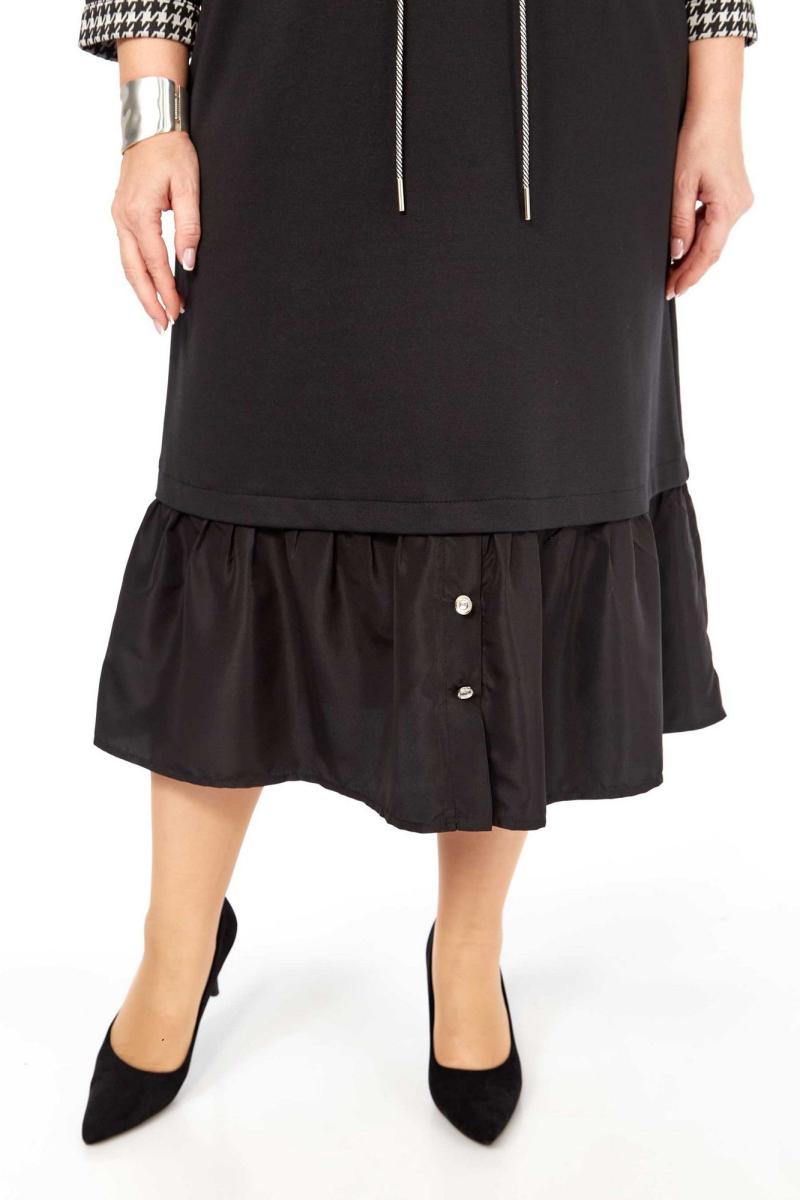 Платье женское полуприлегающего силуэта из трикотажной ткани двух видов: черной и "гусиная лапка". Воротник рубашечного типа. По центру переда планка с застежкой на петли-пуговицы. По переду есть нагрудные вытачки, клапаны и кулиска в области талии. В кулиску втянут декоративный шнурок. По низу платья волан с декоративной застежкой. Рукав втачной с манжетом. Длина изделия 119 (±2) см. Длина рукава 48 (±1) см. Объём груди размер 56 – 116 (±2) см. размер 58 – 120 (±2) см. размер 60 – 124 (±2) см. Объём талии размер 56 – 116 (±2) см. размер 58 – 120 (±2) см. размер 60 – 124 (±2) см. Ширина рукава под проймой размер 56 – 20 (±2) см. размер 58 – 21 (±2) см. размер 60 – 22 (±2) см.