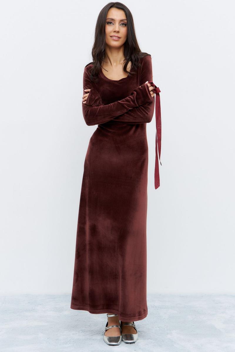 Платье в длине миди, приталенного силуэта. Выполнено из ткани с эффектом бархата, в глубоком бордовом цвете. Рукав удлиненный.