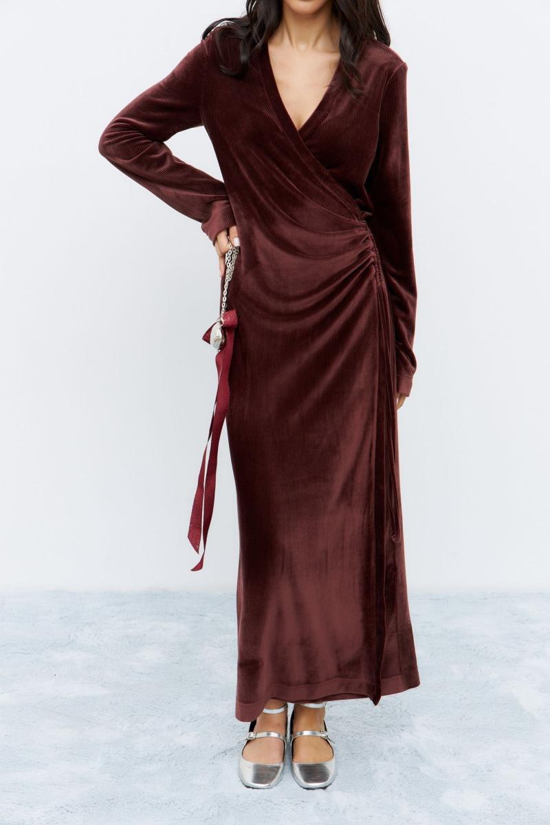 Платье в длине макси, выполнено из ткани с эффектом бархата, в бордовом цвете. Платье на запах, драпировка по переду сбоку изделия. Рукав длинный, вырез v-образный