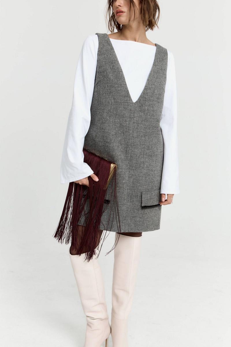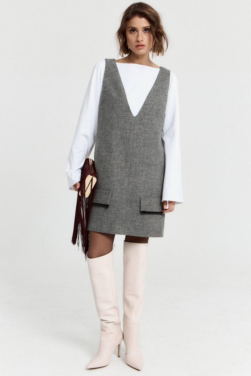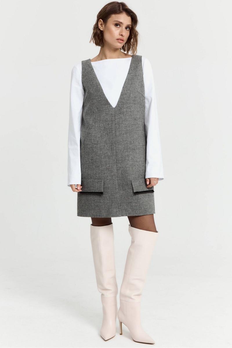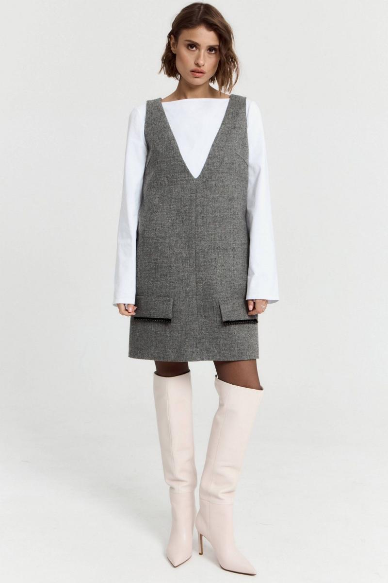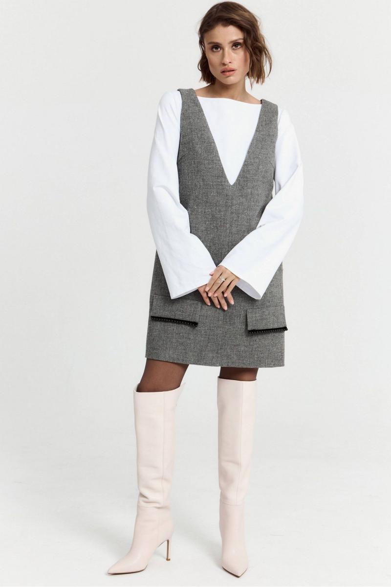 Платье в длине мини, выполнено из костюмной ткани с добавлением шерсти. По переду v-образный вырез, по бокам по груди небольшие выточки, по переду по низу изделия декоративные клапаны. Функциональные карманы внутри боковых швов изделия. Платье полностью на подкладке. Длина по спинке 83
