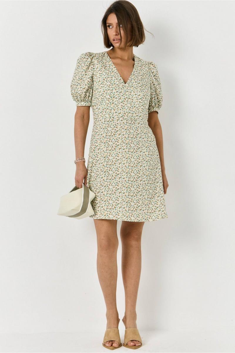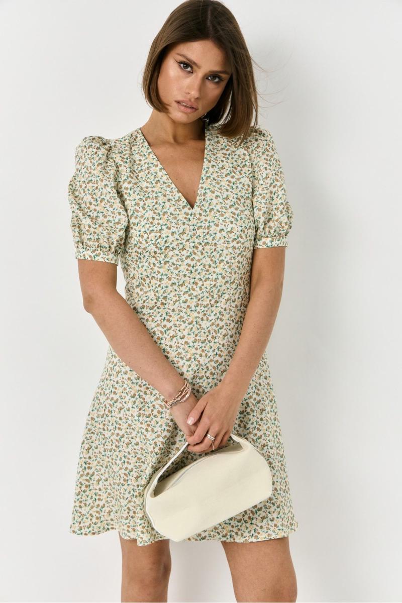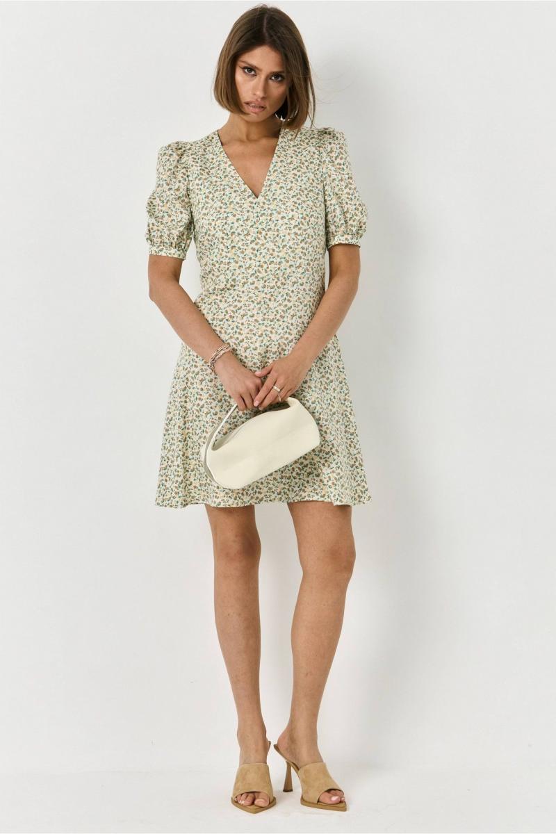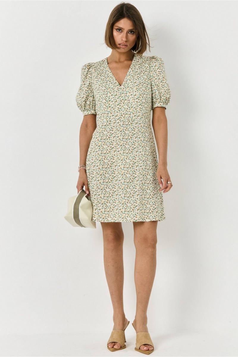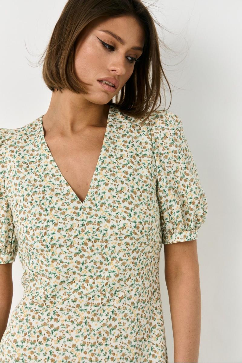 Платье полуприлегающего силуэта, выполнено из вискозы. Платье с V-образным вырезом горловины. Рукав втачной со сборкой, по низу на манжете с небольшой пуговицей. По спинке потайная молния.