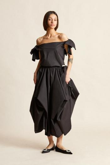Платье прилегающего силуэта, на притачной подкладке. По переду платье состоит из двух частей. На верхней части драпировка по линии талии. Нижняя часть переда со средним швом и драпировкой от линии талии до линии бедер. Вырез V-образный. Рукав втачной.