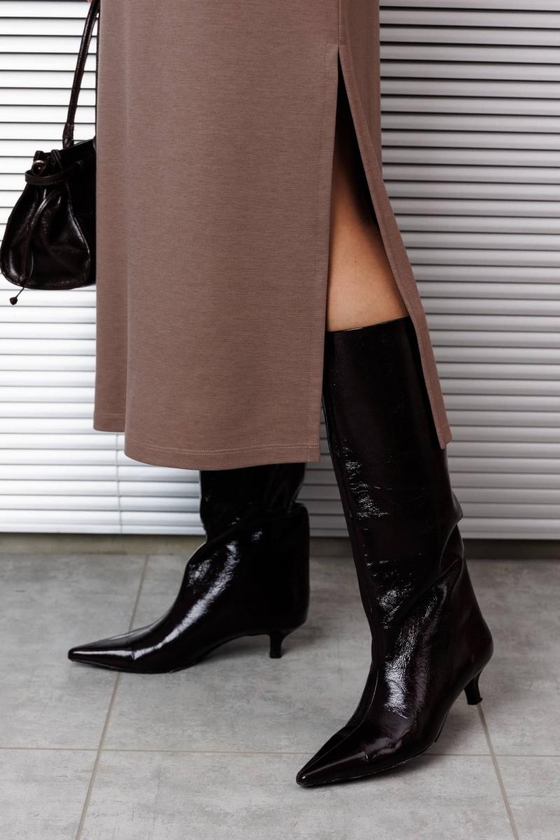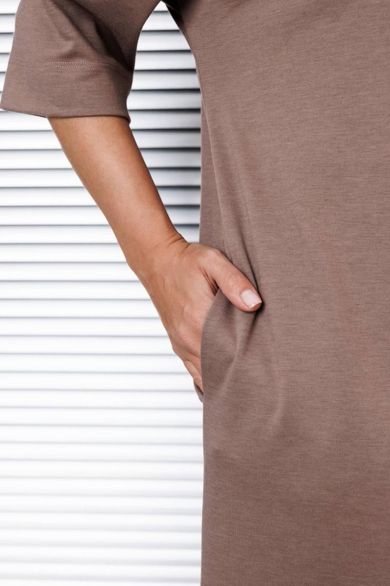 Платье женское трикотажное, свободное "оверсайз", со спущенной проймой и 3/4 рукавом, вырез горловины полукруглый с планкой, в боковых швах-карманы и разрез слева.