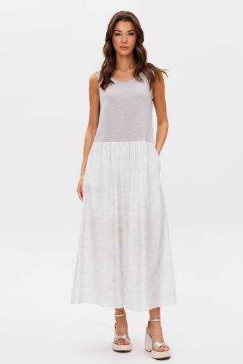 Платье женское летнее, комбинированное из двух видов ткани: вышивки и однотона. Свободного силуэта, расширенное книзу, вырез горловины-полукруглый, рукав спущенный цельнокроенный, застёжка спереди на планку с пуговицами, по переду карманы со скосом, изделие частично на подкладке. Ширина по линии груди (46):49см (48):51см (50):53см (52):55см (54):57см (54):57см Длина 122-127см Рукав 17,5-22,5см