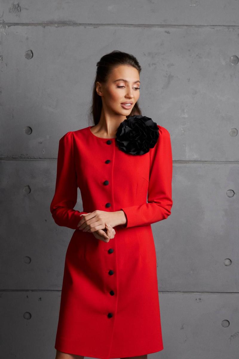 Платье женское из однотонной ткани, прилегающего силуэта, вырез горловины полукруглый, рукав втачной со сборкой по верхней части, застежа спереди на пуговицы, по переду и спинке изделия вытачки, спереди отделочная деталь-декоративный цветок из ткани, съемный, платье на подкладке. Ширина по линии груди (42):45см (44):47см (46):49см (48):51см (50):53см (52):55см Ширина по линии бедер (42):47см (44):49см (46):51см (48):53см (50):55см (52):57см Длина изделия 91-92см Длина рукава 62см