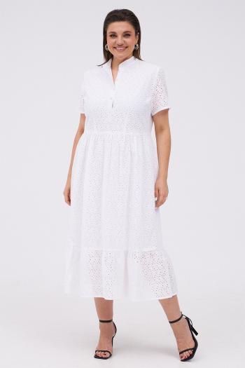 Платье полуприлегающего силуэта, с втачным двухшовным рукавом 7/8. Полочка с вышивкой и пришивными бусинами, с нагрудной вытачкой, горловина платья округлая. Спинка с застежкой на потайную тесьму-молнию по среднему шву спинки и талиевыми вытачками.