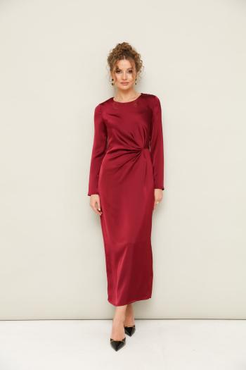 Платье прямое, с открытыми плечами, длинной миди, с поясом из основной ткани. Поверху платья притачная планка на резинках. Рукав 7/8 внизу со сборкой на манжете с застежкой на петли пуговицы. Перед с центральной застежкой по цельнокроеной планке на петли-пуговицы и карманами в боковых швах. Платье с фигурным низом, без подкладки. Пояс из основной ткани
