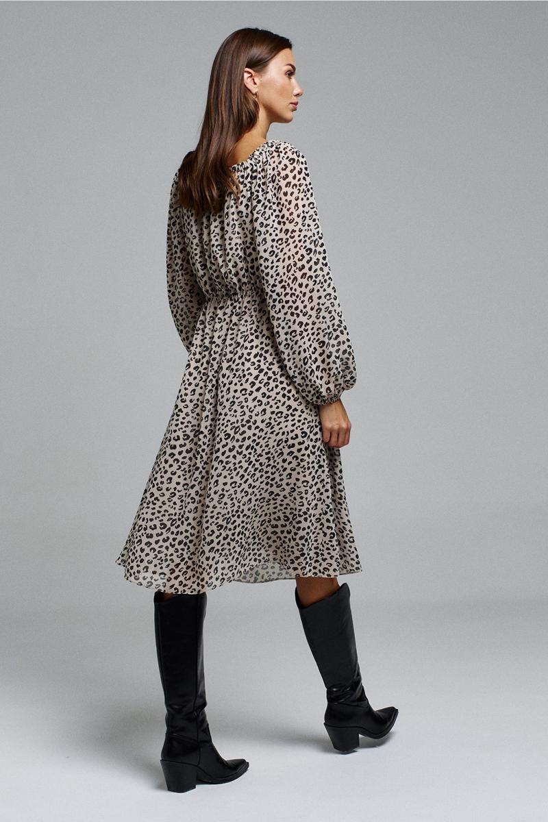 Платье шифоновое А-образного силуэта. Рукав длинный вверху и внизу на резинке. Горловина обработана планкой с резинкой. На талии кулиса с завязками по бокам. Платье на подкладке.