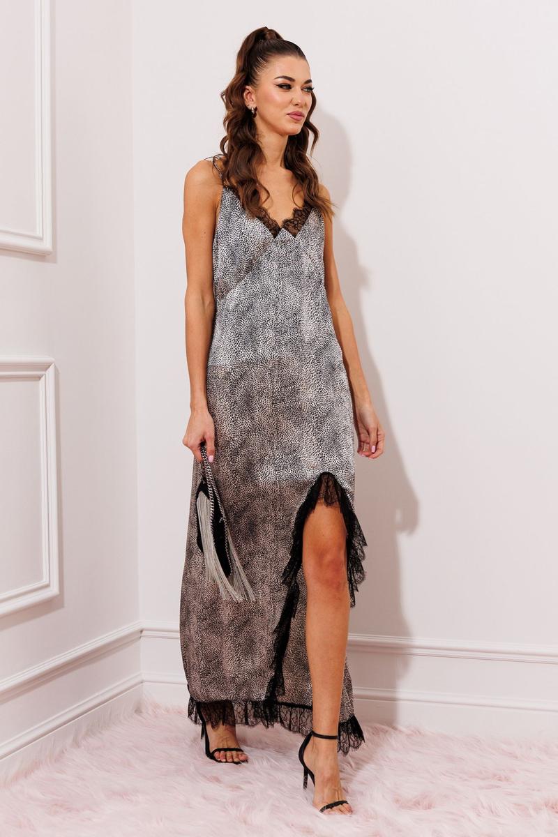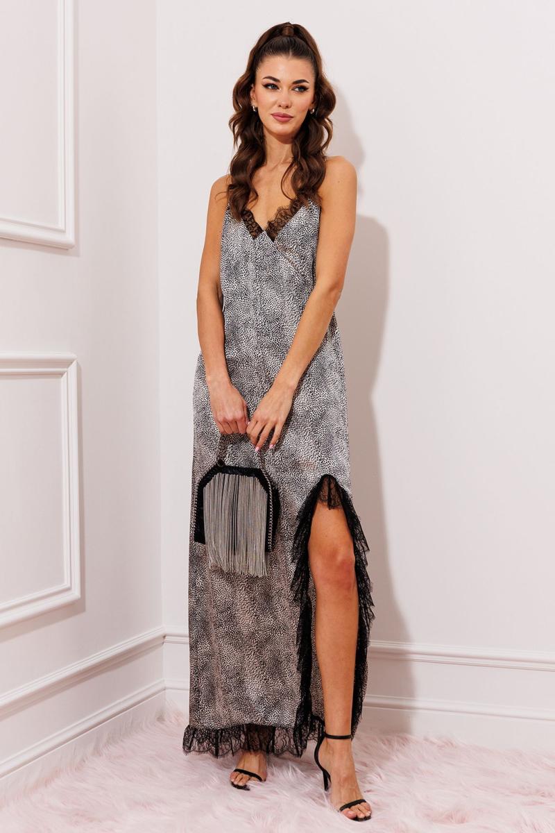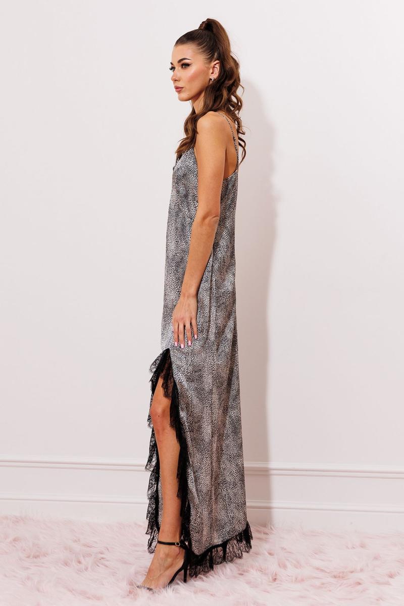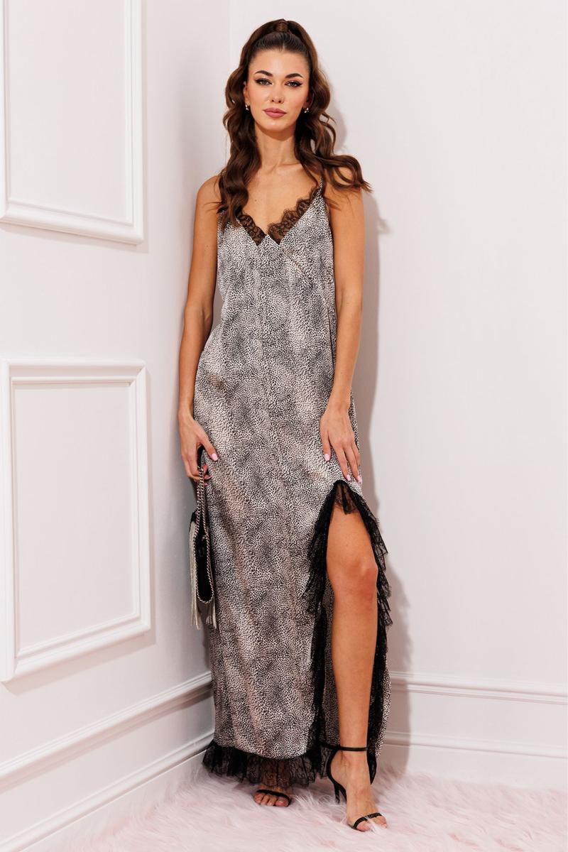 Платье на регулируемых бретелях, полуприлегающего силуэта, расширенное к низу. Полочка с рельефными швами под грудью, вставками из кружева по краю выреза. С фигурным разрезом по левой стороне платья и кружевом, переходящим на низ изделия и на спинку. Спинка на регулируемых бретелях вверху. Низ с отделкой из кружева.