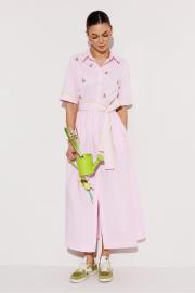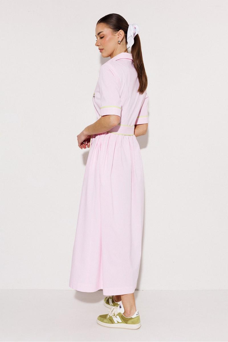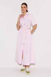 Платье длинное с втачным рукавом до локтя визу на манжете. Полочка с центральной застежкой на петли-пуговицы и с нагрудной вытачкой. По лифу платья-вышивка. Платье отрезное по линии талии и со сборкой по шву притачивания низа. Воротник рубашечный отложной на стойке. Платье без подкладки.