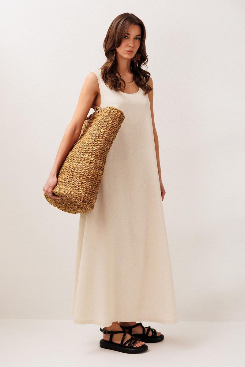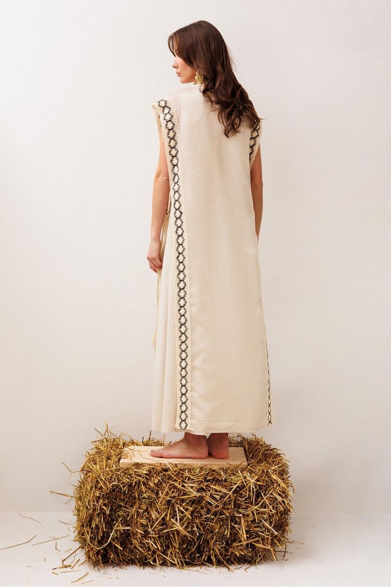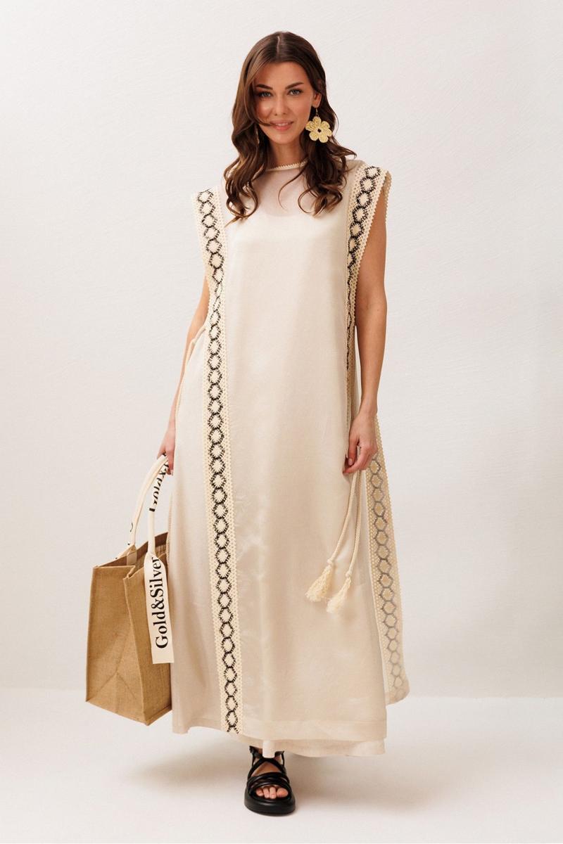Платье длинное, состоящие их верхнего и нижнего. Верхнее платье из полупрозрачной ткани, слегка расклешенное к низу без рукавов. По бокам платье не стачено с завязкой на декоративный шнурок. По всей длине полочки и спинки по бокам настрочено кружево. Горловина округлая с притаченым к ней кружевом. По спинке вырез капля с застежкой на навесную петлю-пуговицу. Нижнее платье А-силуэта без рукавов, с карманами в боковых швах. Вырез горловины – округлый.