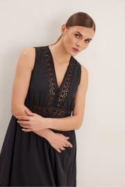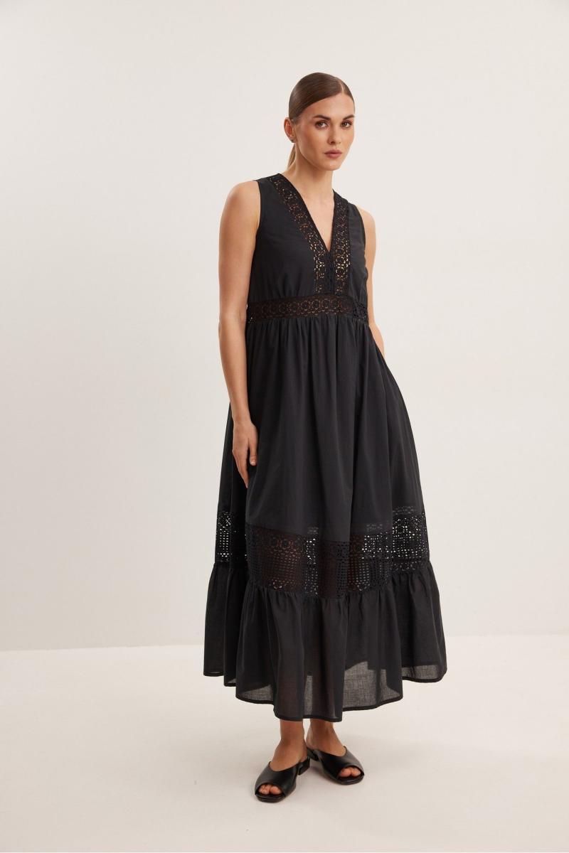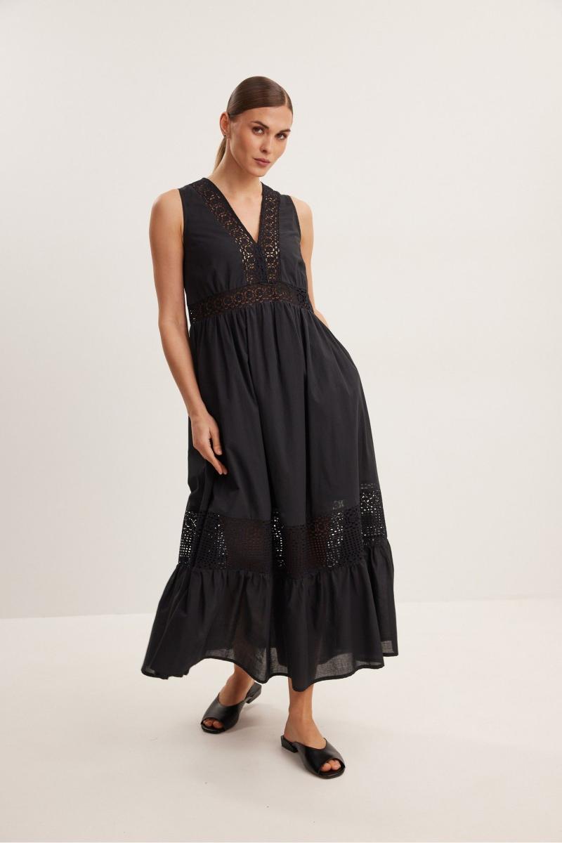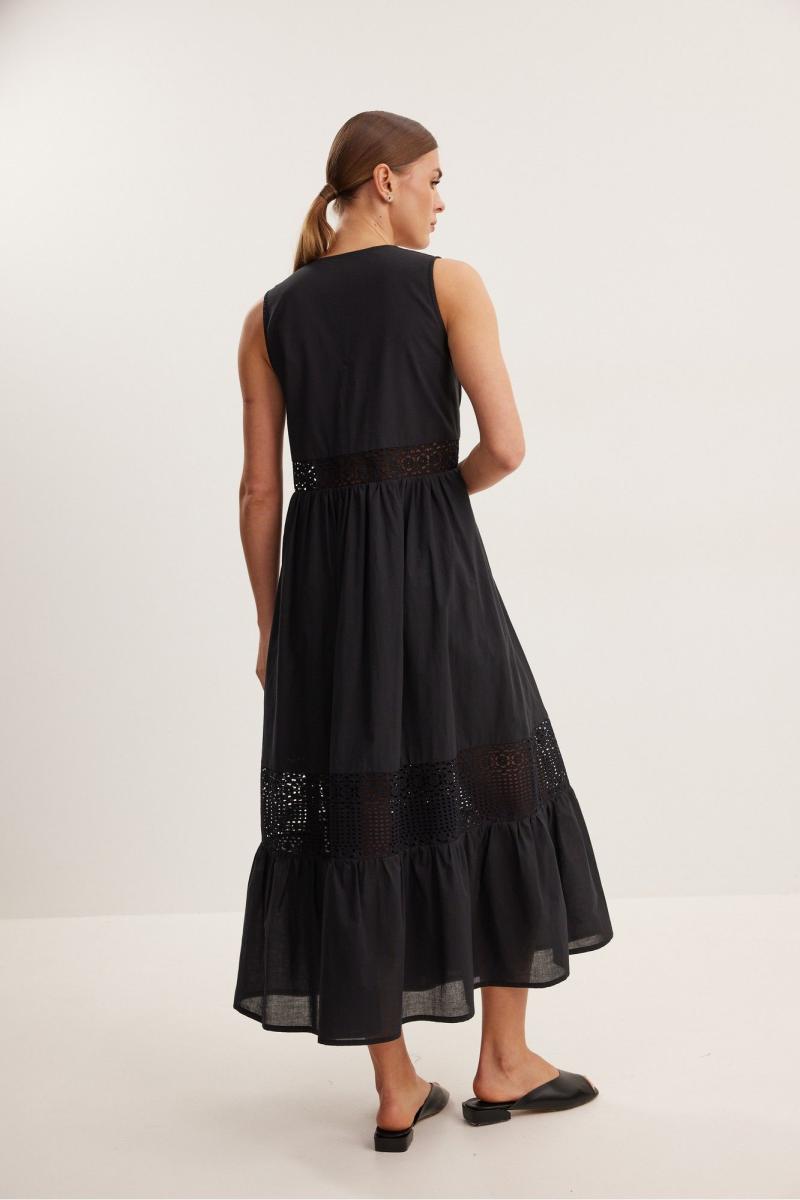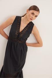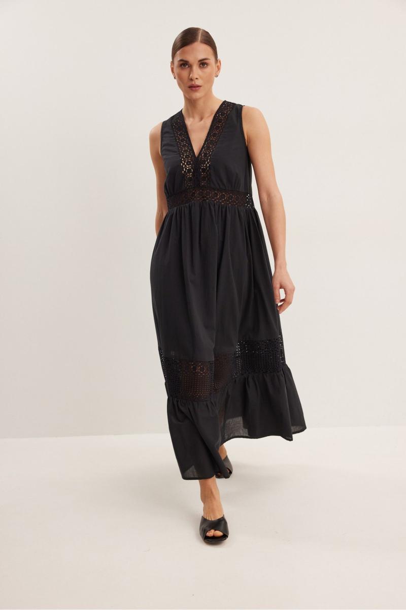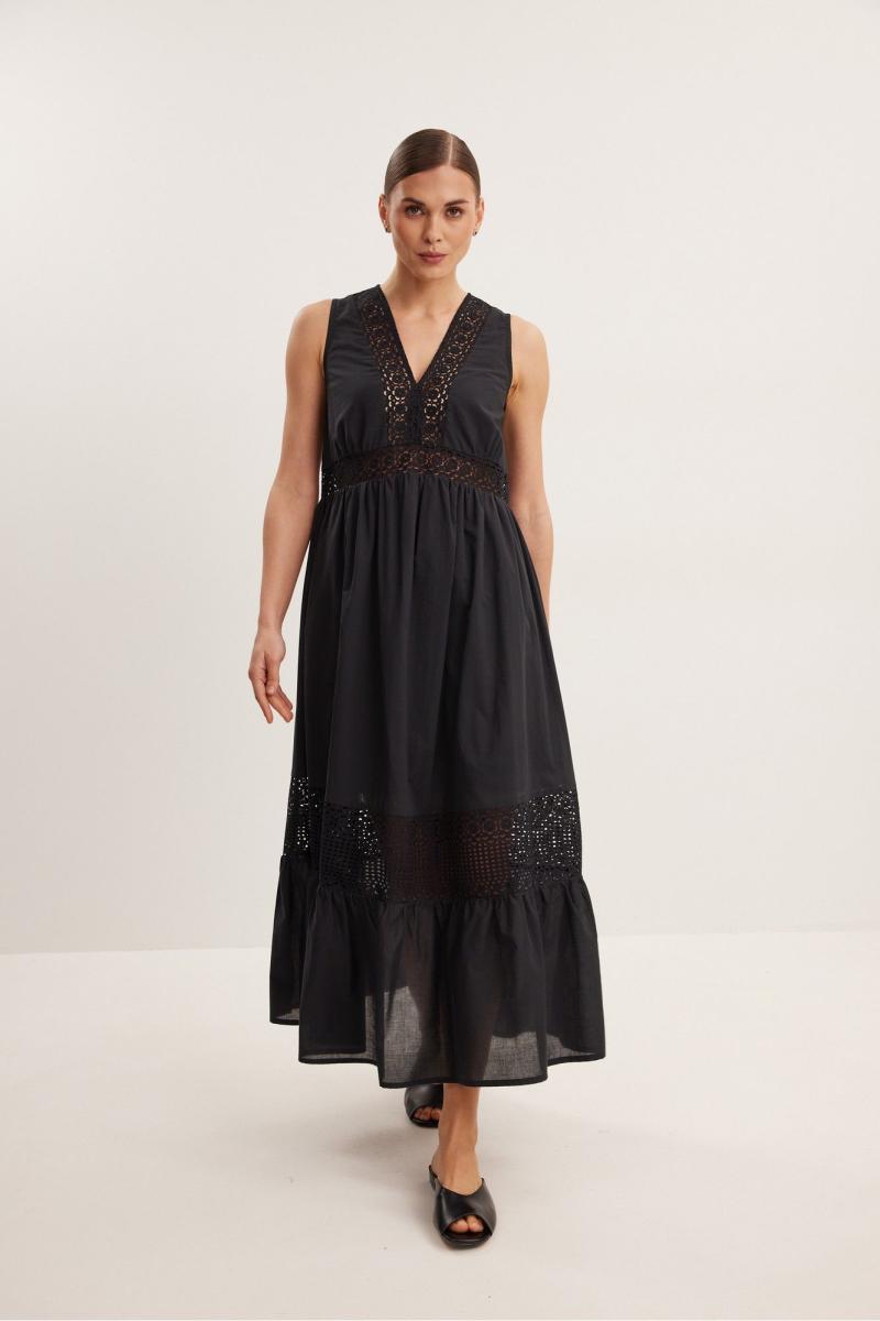 Платье женское , свободного А -силуэта . Выполнено из двух типов ткани :однотонного хлопка и ришелье , очень приятных на ощупь . Горловина оформлена Y-образным вырезом с отделкой из ришелье.Платье отрезное под грудью .Нижняя часть платья также с отделкой и оборкой . По боковым швам функциональные карманы , платье на хлопковой подкладке .
